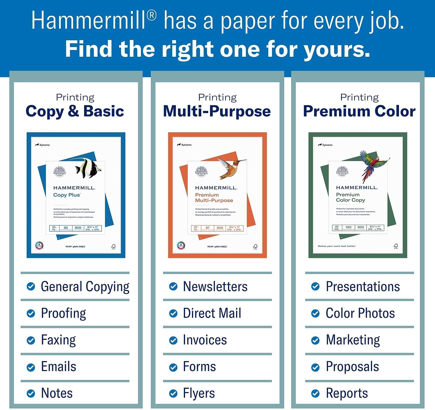 - PREMIUM COLOR COPY PAPER – Hammermill Premium Color Copy 32lb Paper provides a high-tech sheet that’s designed to show your work at its best so you can confidently use it for design proposals, full-color presentations, photographs, brochures and more.