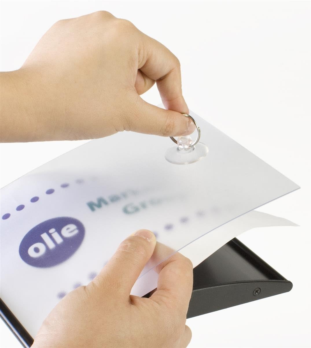 - Non-glare lens holds a displayed sign in place; included suction cup is used to pull the lens off to insert new signage.
