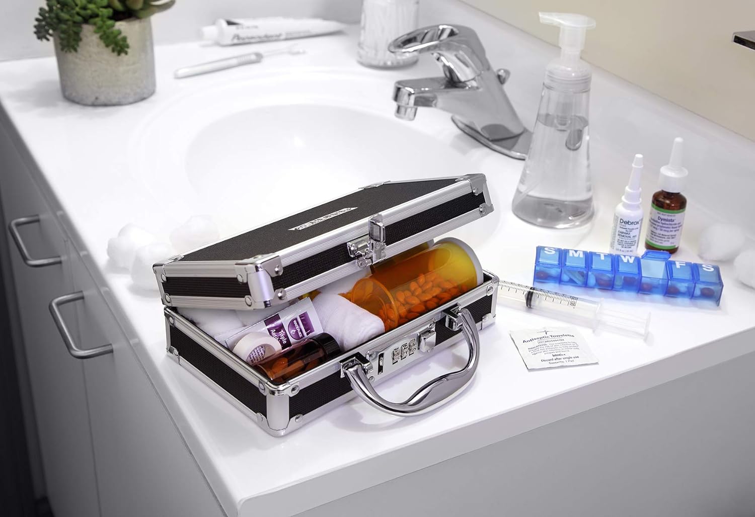 - SUPER STURDY - Our medicine lock box is the perfect solution for safe keeping. 4 steel corners, aluminum reinforcement, and an extra strong combination lock ensure your materials are secure.