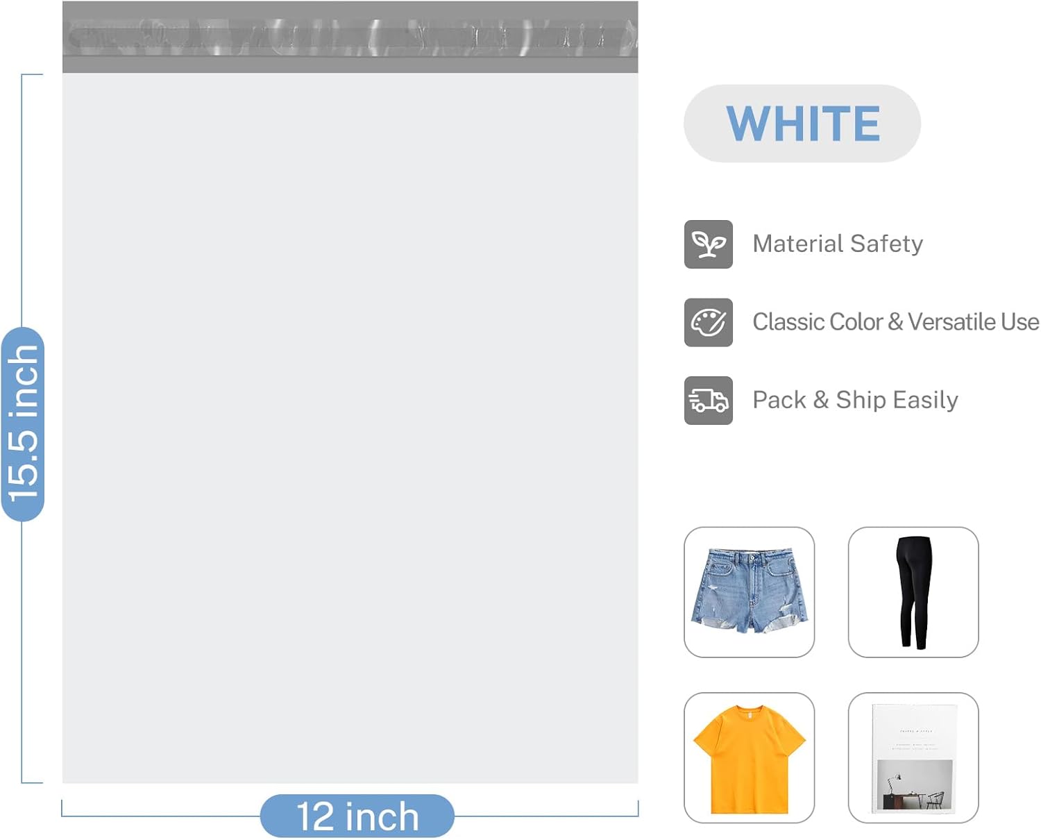 - WHITE 12X15.5 POLY MAILERS - Our premium poly mailers are a trusted and reliable shipping solution for your business needs. Each envelope measures 12" x 15.5" and is designed to provide superior protection for your products during transit.