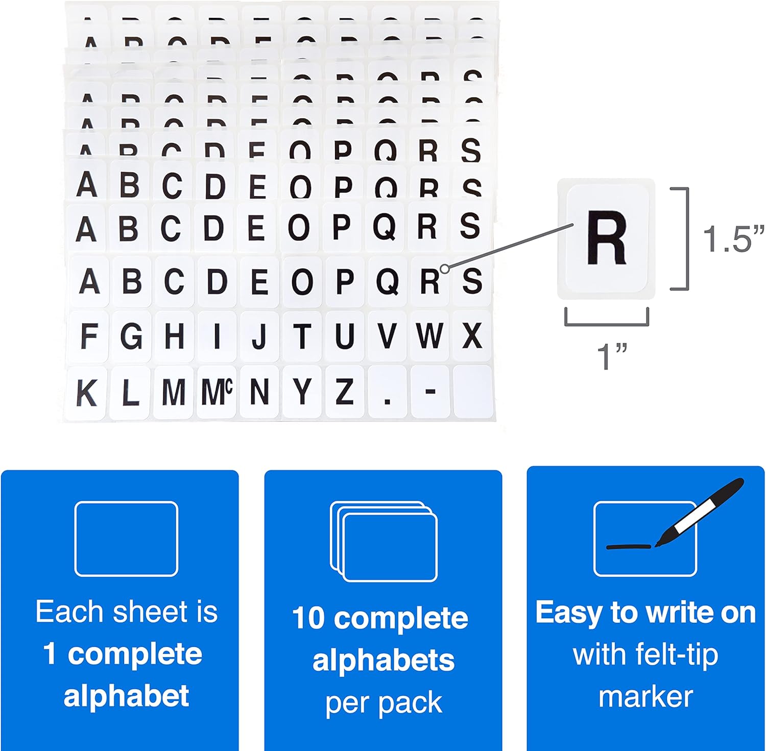 - 10 Complete alphabets per pack which come on sheet liners