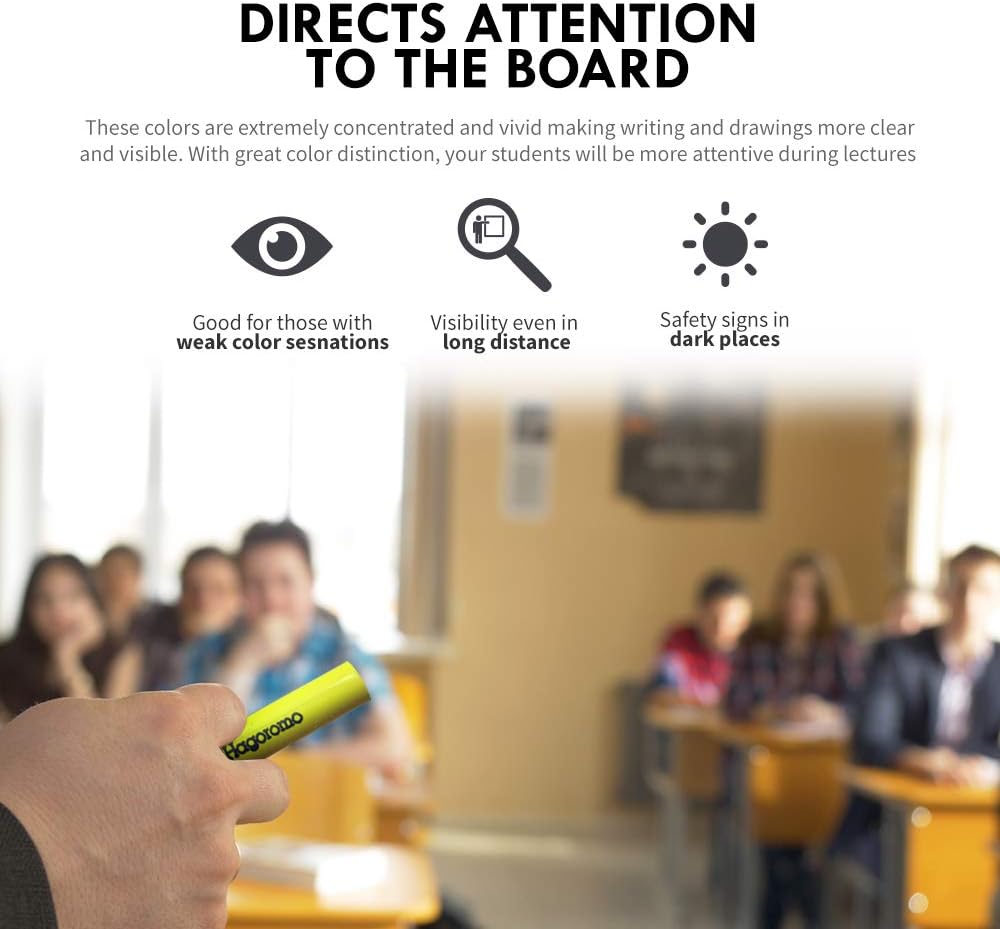 - LUMINOUS CHALK: Clear, vivid and bright luminous colors are effective at highlighting important topics in lectures, writing work instructions at construction sites or adding a pop of color to an art piece. Bright colors grab student's attentions quicker and make them more concentrated on the information at hand. Especially ideal for students with weak color sensations/identification as well as short-sighted students as vivid colors can be seen from a distance