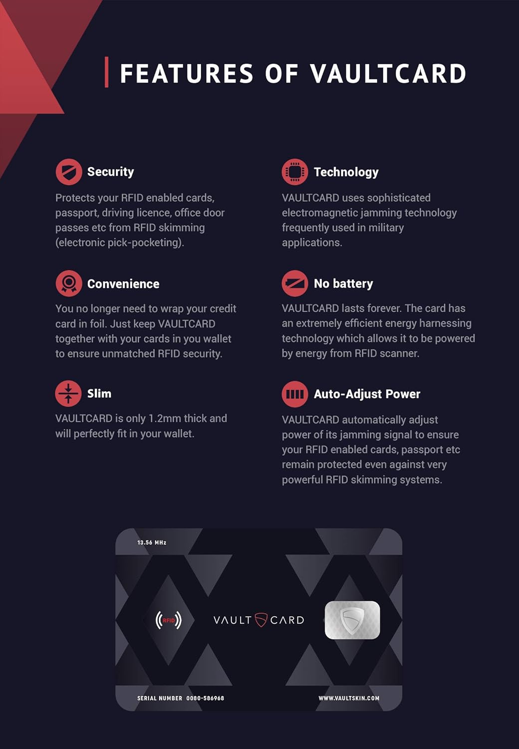 - CONVENIENCE - You no longer need to wrap your credit card in foil. Just keep VAULTCARD together with your cards in your wallet to ensure RFID security.