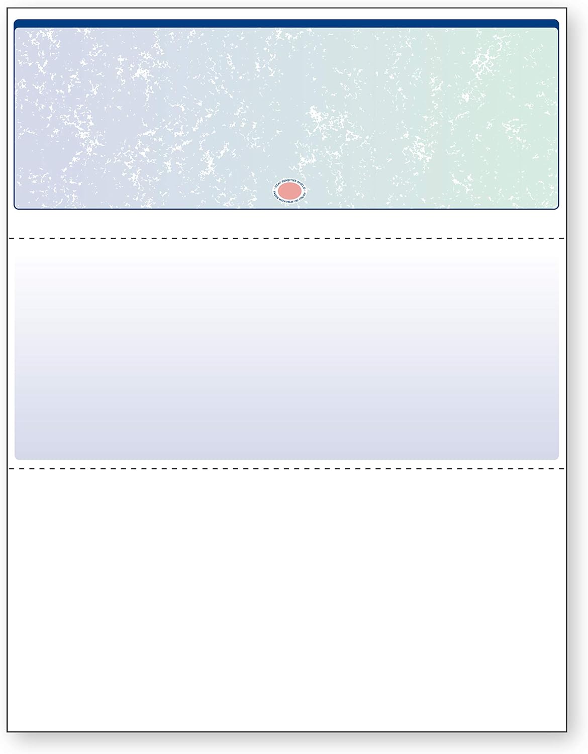 - Checks are located at the top of the sheet (3.5” tall x 8.5” wide) and there are 2 horizontal perforations located at 3.5" and 7" from the top