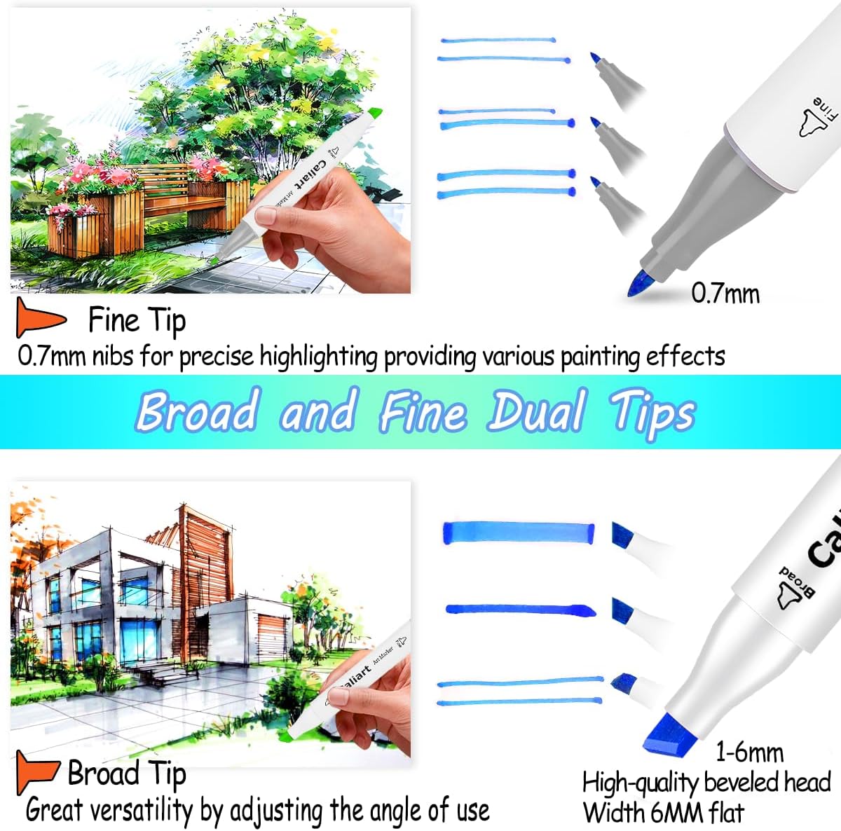 - 🎨 Dual Tips & Round Pen Holder - Broad chisel (approx. 1-7mm) and fine point (approx. 0. 7mm) nibs for precise highlighting and underlining. Allowing you to write in both thin and thick lines, providing great versatility. Caliart artist markers are great for providing various styles, sketches and patterns with ease. NOTE: as they are Alcohol Based Markers like ALL other brand alcohol markers, they will Bleed through regular coloring paper, except very thick paper, marker paper.