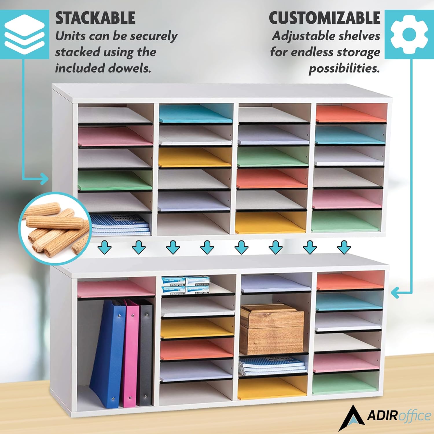 - STACKABLE: Our literature organizers can be easily and securely stacked using the dowels included allowing you to seamlessly add storage space as you need it.
