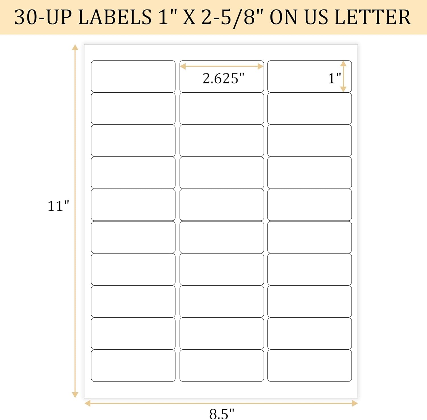 - 【Specification】Label size: 1" x 2-5/8", Sheet size: 8-1/2" X 11" (US Letter Size). 30 Labels per sheet, total 100 Sheets = 3000 Labels
