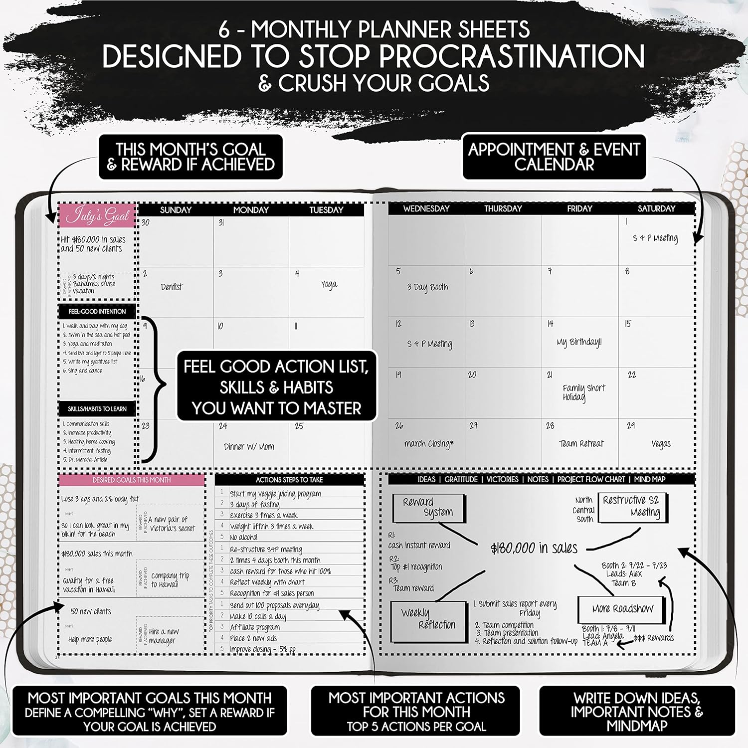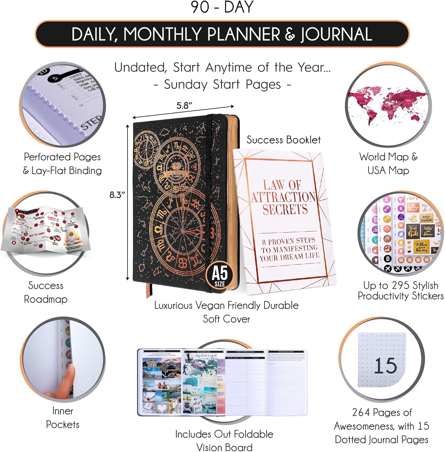 - MANIFESTATION JOURNAL - This deluxe life planner comes in A5 size (5.8 x 8.3 inches). The life planner comprises 264 pages of thick 100 gsm paper, including 90 daily planning sheets, guiding you on how to become the best possible version of yourself on a mental, physical, and interpersonal level. It's a unique diary based on leading scientific studies proven to increase productivity and happiness. The journal features an out-foldable vision board to help you stay focused, morning and evening power questions, mind maps, reflection pages, habit trackers, a back pocket, and much more than any other planner on the market!
