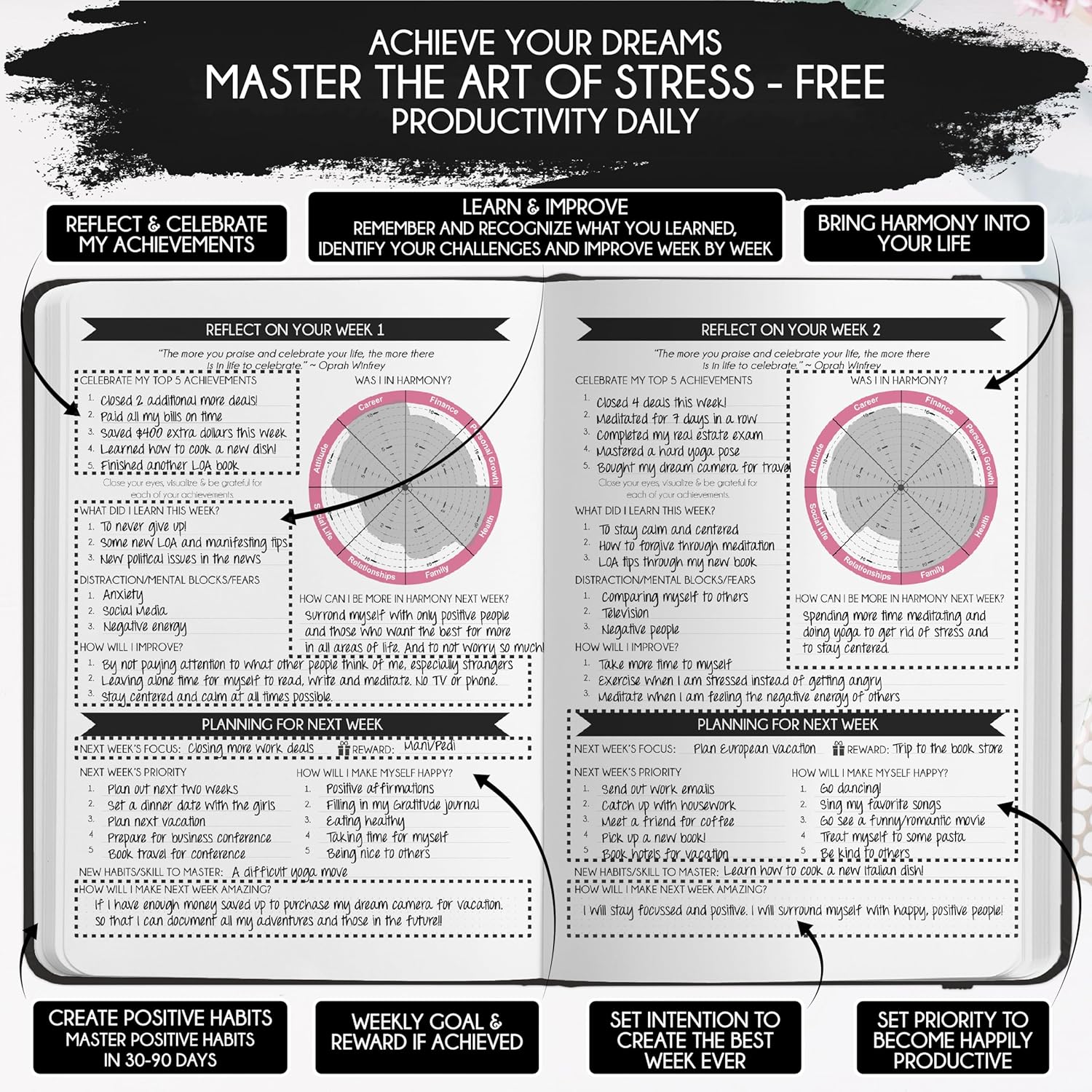 - LIFE PLANNER – Increase your productivity and happiness. Learn to focus on top priorities and delegate effectively to achieve more and create free time for yourself. This daily planner includes To-Do Lists, a Feel-Good List, and a Gratitude Journal to prioritize self-care. Unlock your potential and master time management with the 5 Minute Journal, inspired by successful strategies worldwide. Follow the eight steps outlined in this planner to achieve remarkable results and discover your life purpose and passion.