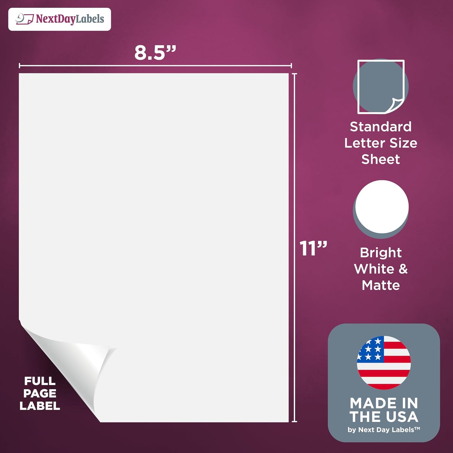 NextDayLabels - Full Page Labels 8.5 x 11 - White Shipping Labels - 8.5 x 11 Label Paper for Printer - Large Blank Matte Sticker Printer Paper - Laser/Inkjet Printer Labels (1 Per Sheet, 100 Labels)