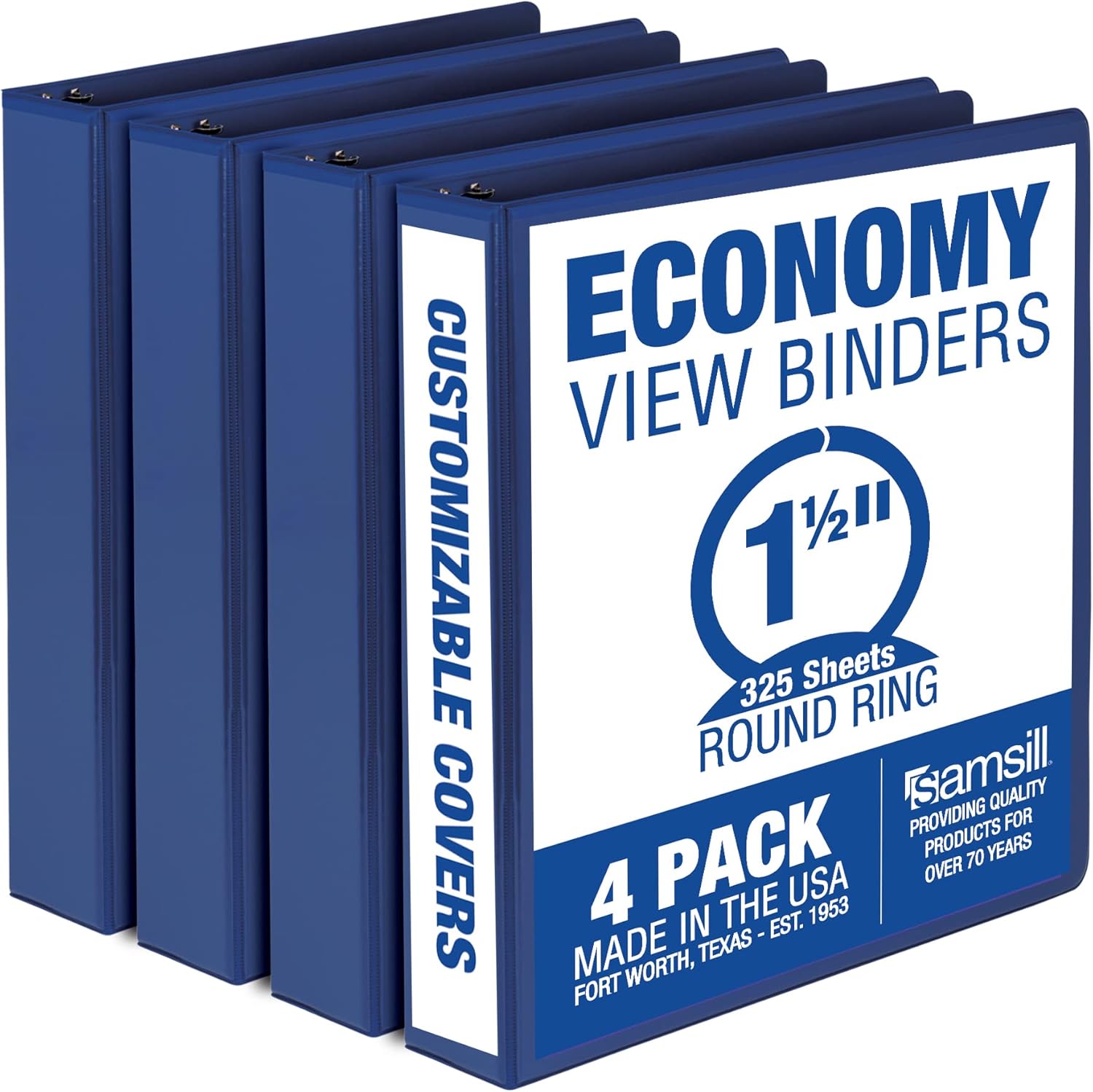 Samsill 1.5 Inch 3 Ring Binders, Made in USA, Economy Round Ring, Clear View Cover, 325 Sheet Capacity - for School, Home, Office - Blue, 4 Pack
