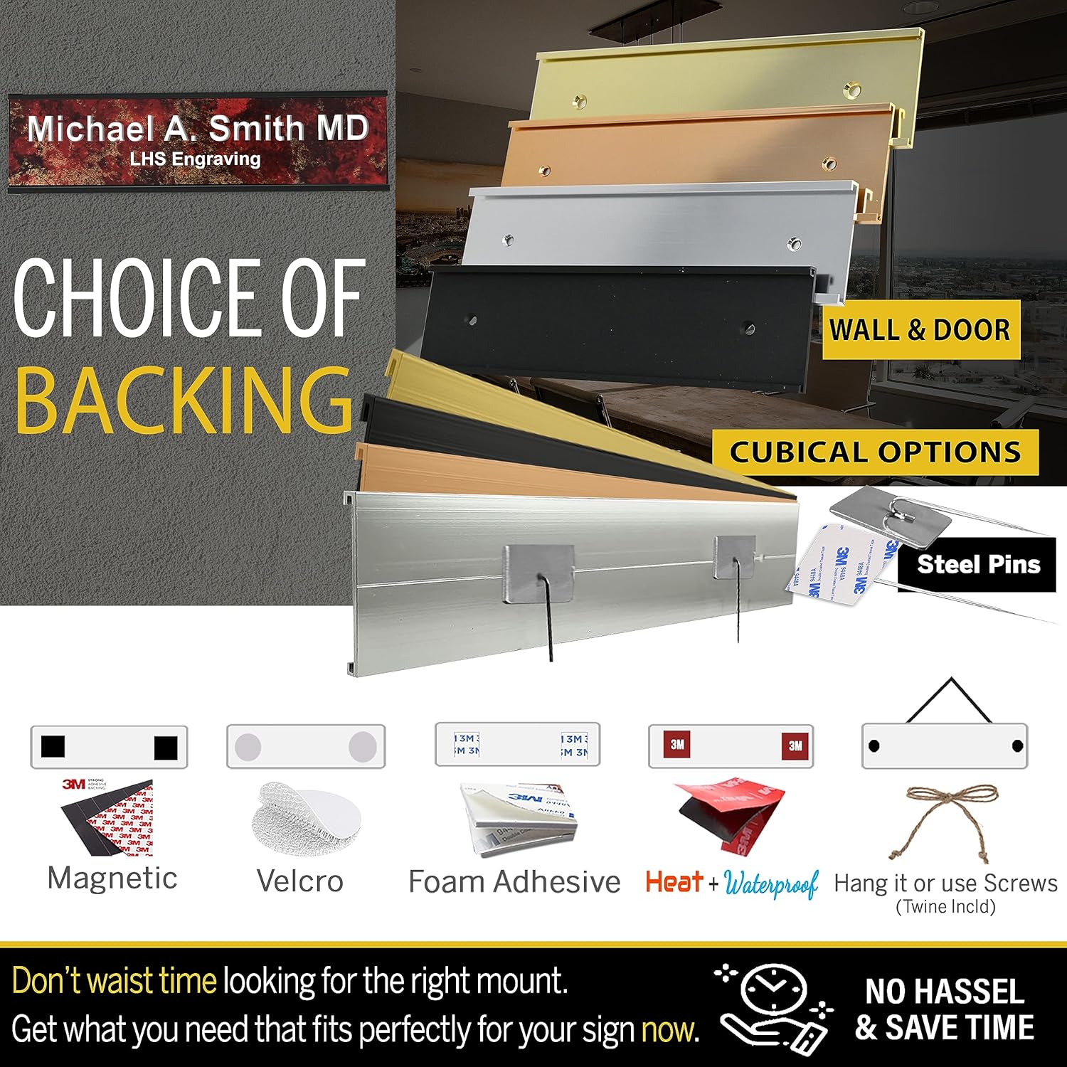 - 🟡 Click Personalize: Add 3 lines of text | Option to add a desk, wall or a door holder or choose adhesive, hanging, cubicle pins, or all weather adhesive option