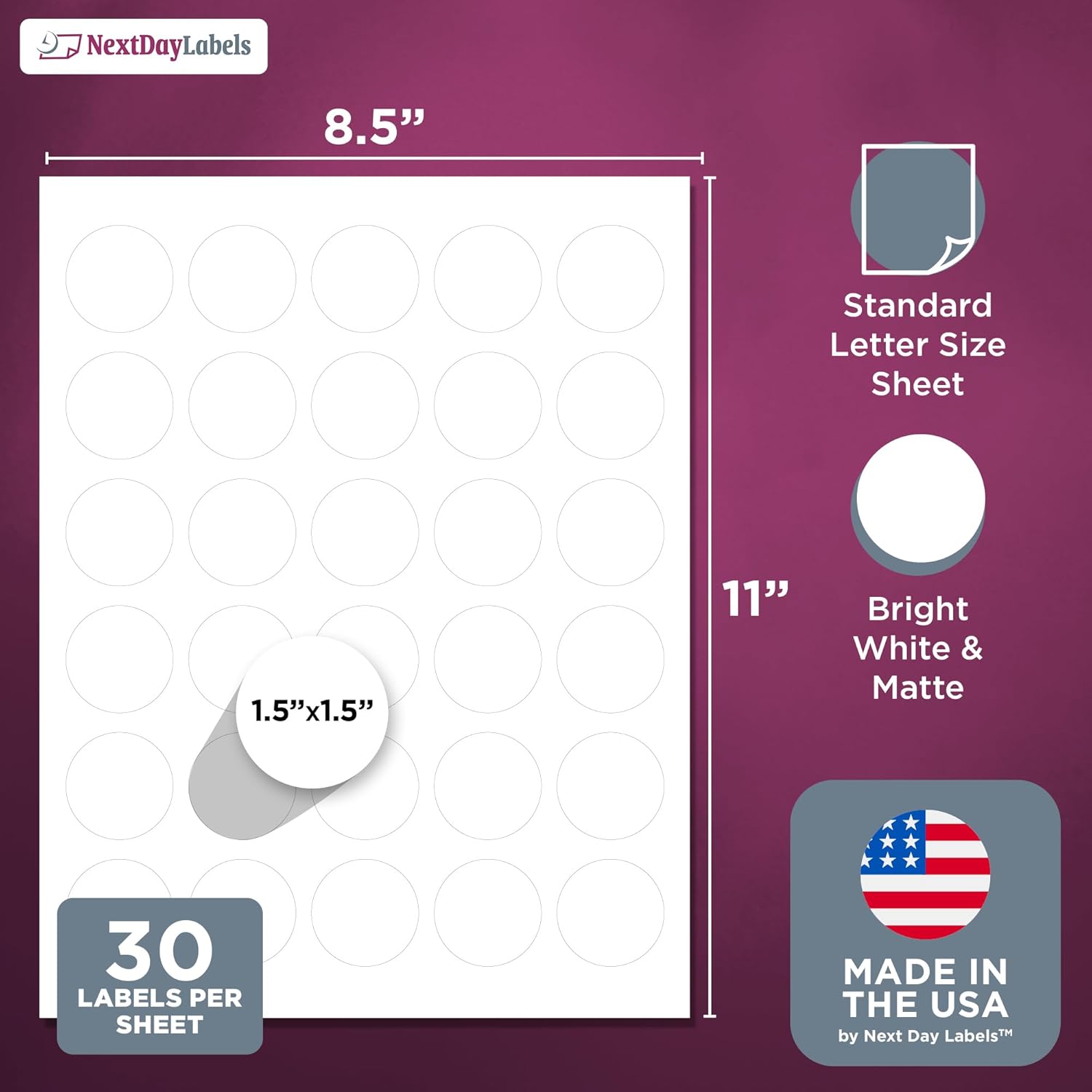 NextDayLabels – 1.5 Inch Round Sticker Labels for Printer - Matte White Blank Laser/Inkjet Printer Labels - Circle Stickers - Printable Labels (1500 Total)
