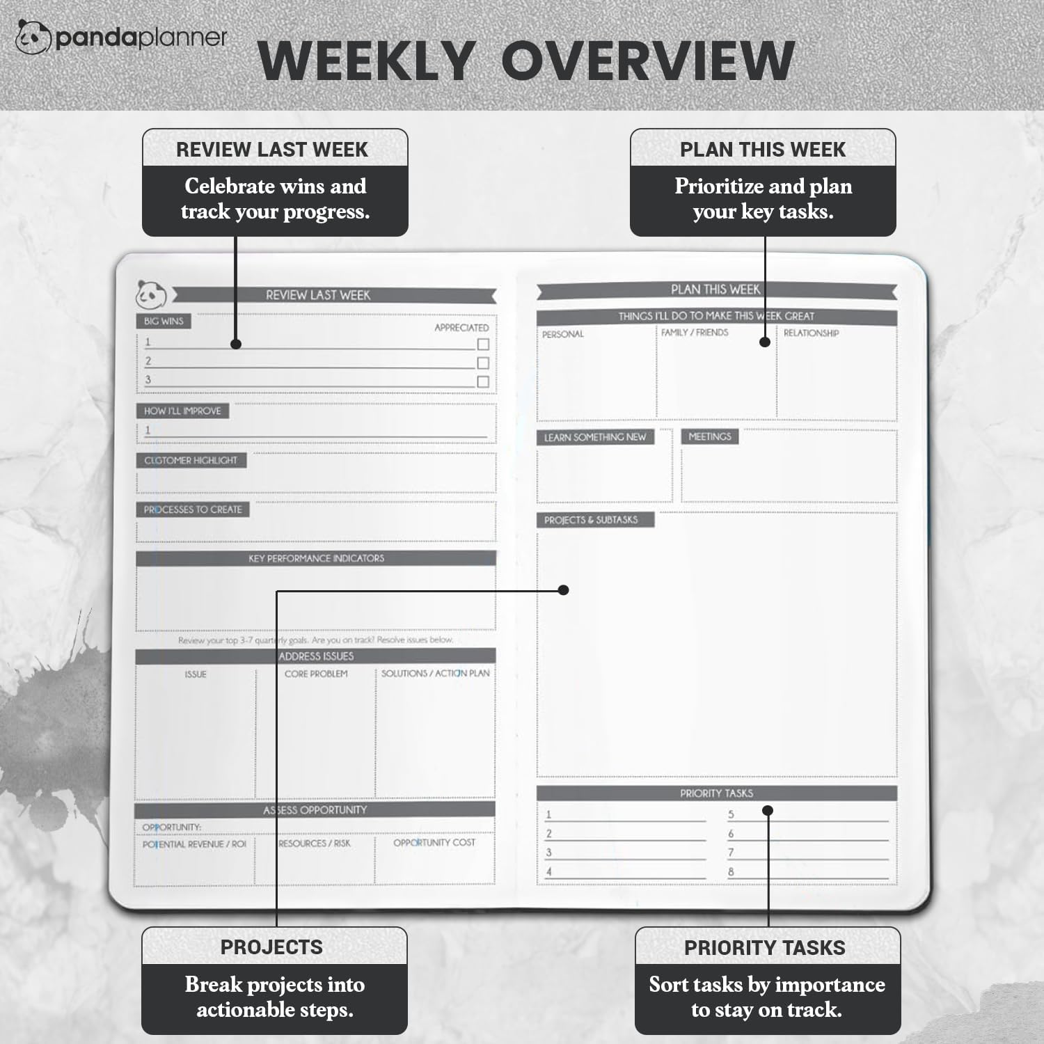 - BE MORE PRODUCTIVE - Daily, weekly & monthly sections help you organize your present and future