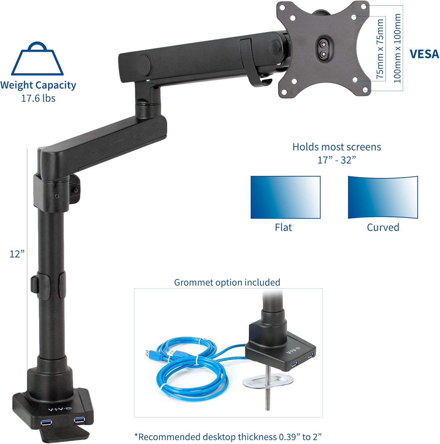 - Mounting Options - The sturdy desk clamp installs from the top side of your desk for easy setup, and an equally secure grommet mount is provided to accommodate a variety of desk layouts. Recommended desktop thickness ranges from 0.39” to 2”.