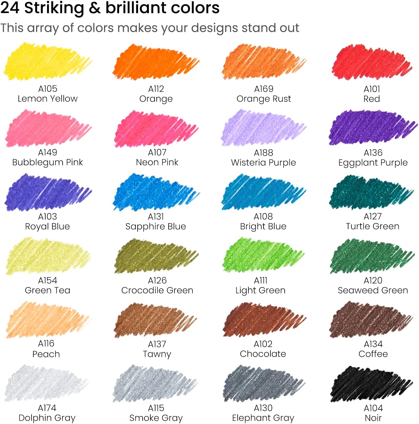 - Bright and Vibrant Colors: This set includes 24 fine point markers that deliver eye-catching content. Every pen is labeled with the color number on the barrel and the name for easy identification.