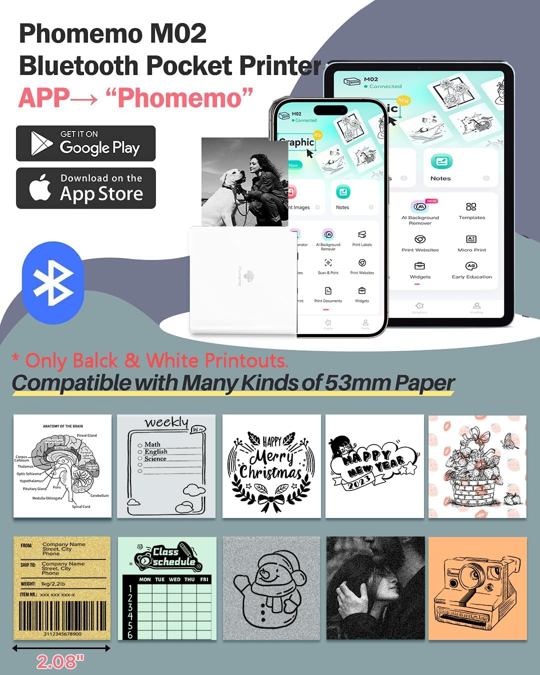- Mini Mobile Printer with Powerful APP- one-click printing, saving time and effort, phomemo M02 note printer can print photos and text instantly, phomemo app offers variety of fonts, filter effects and themes, makes your black and white image more HD.