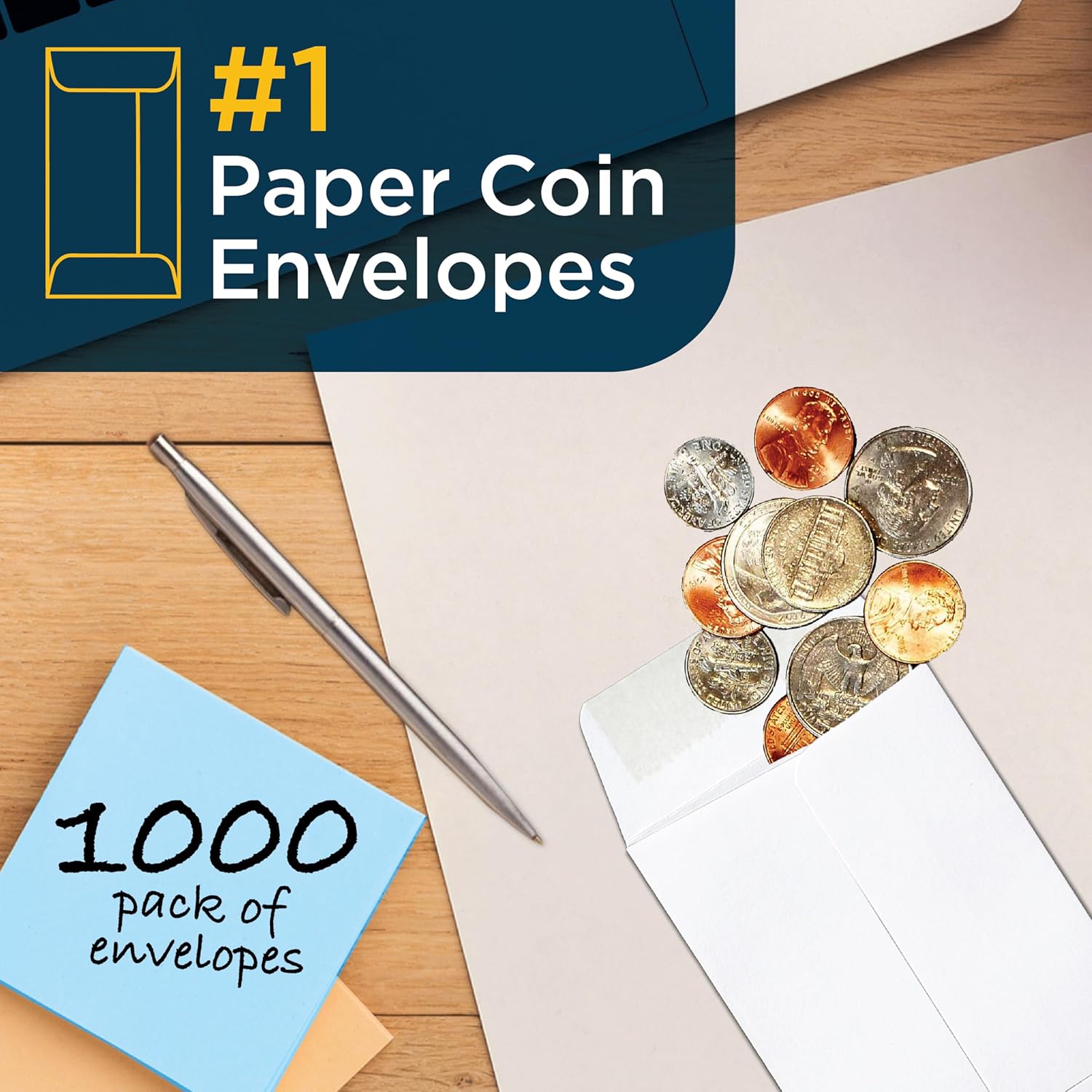 Guardian #1 Paper Coin Envelopes with Gummed Flaps, Pack of 1000 Blank Small Envelopes for Gift Cards, Coins, Receipts, Stamps, Small Parts Storage, and More, 2 ¼ Inches x 3 ½ Inches, White