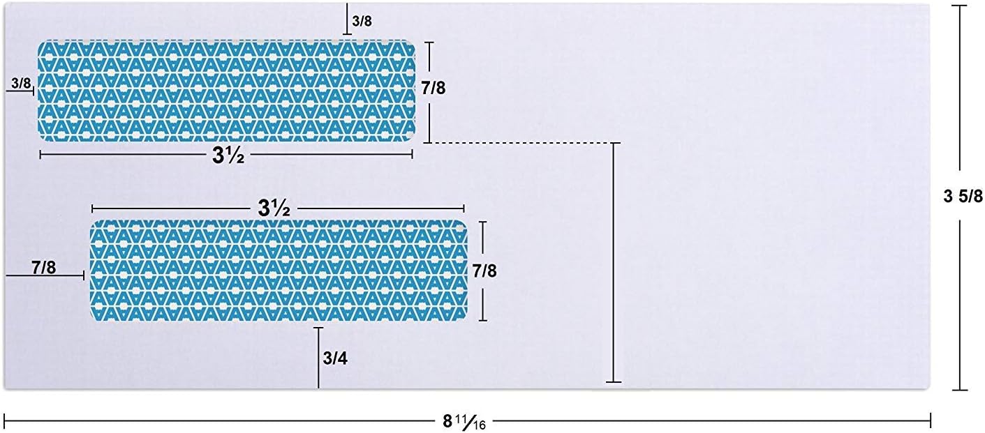 - ✉️ DUAL WINDOW CUSTOM DESIGNED FOR MAILING BUSINESS CHECKS: Top Window height is 7/8 inch X 3-1/2 inches wide and is positioned 3/8 inch from the left and 2-3/8 inch from the bottom, Bottom Window height is 7/8 inch X 3-1/2 inch wide and is positioned 7/8 inches from the left and 3/4 inches from the bottom