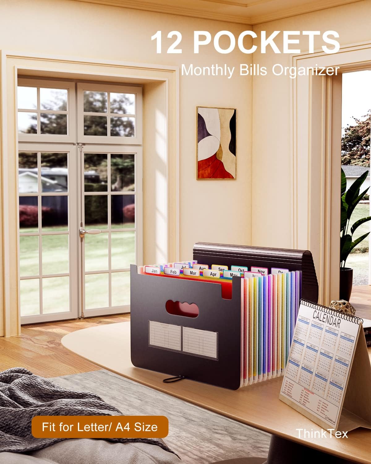 - MONTHLY BILLS ORGANIZER - ThinkTex Portable accordion file organizer, top and bottom both expandable, 12 pockets and multi-colored tabs, for letter/A4 size