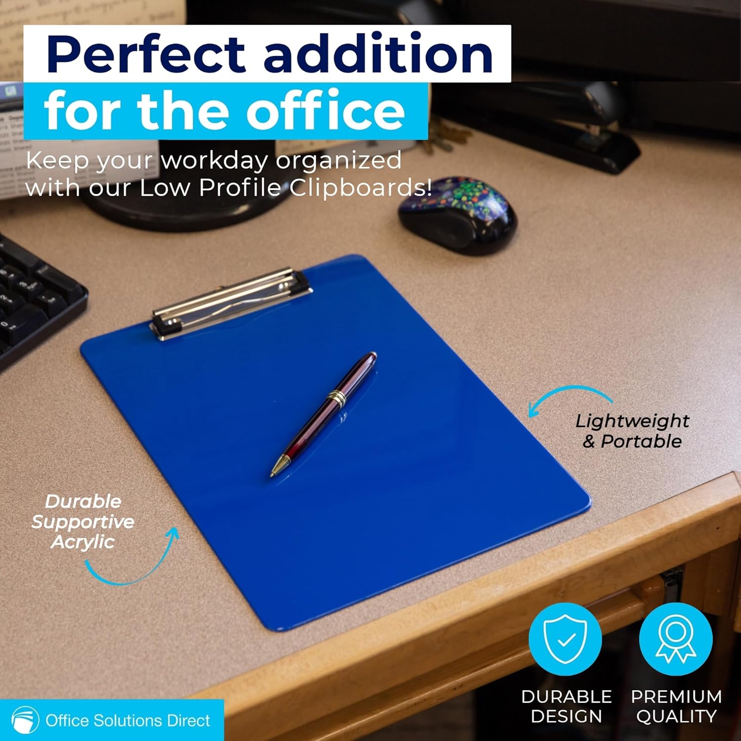 Blue Plastic Clipboard with Low Profile Clip (Pack of 12) - Letter Size Clip Board Blue with Flat Clip, A4 Size Acrylic Clipboard for Boys and Girls | Cute Aesthetic College & Back to School Supplies