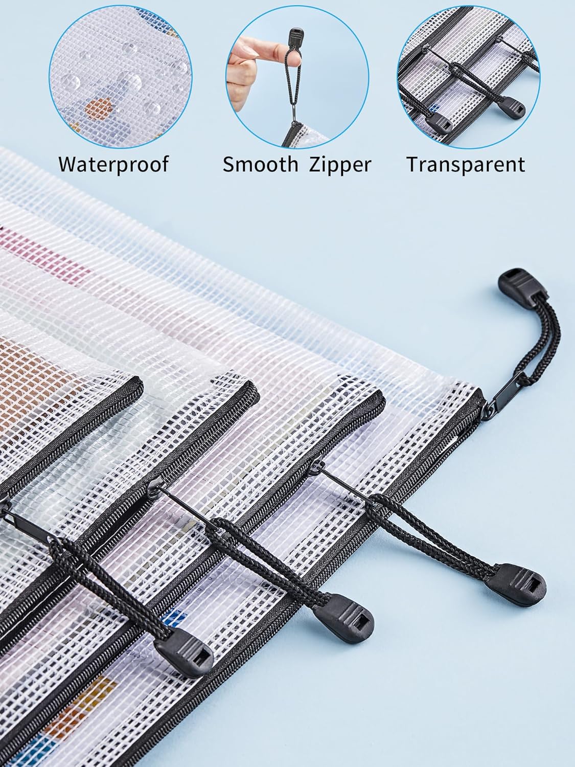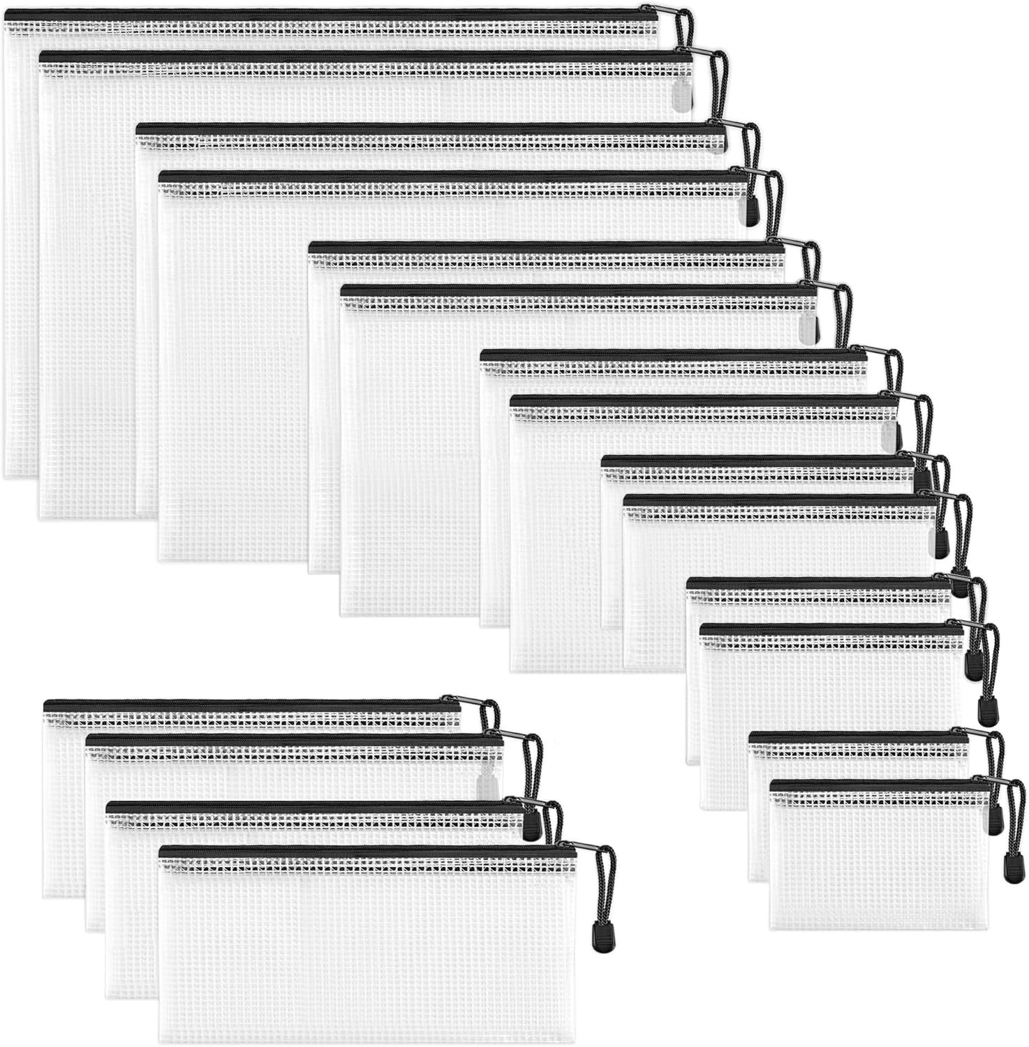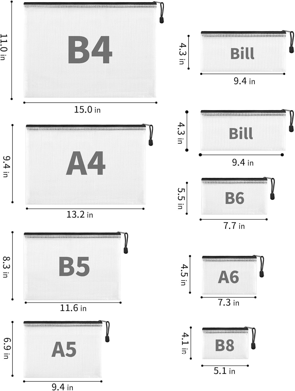 - 18 Pieces Zipper Bags - The package includes 18pcs zipper mesh pouches in 8 sizes. They are 2*B4 (15×11 inches), 2*A4 (13.2×9.4inch), 2*B5 (11.6×8.3 inches), 2*A5 (9.4×6.9 inches), 2*B6 (7.7×5.5 inches), 2*A6 (7.3×4.5 inches), 4*Bills (9.4×4.3 inches), 2*B8 (5.1×4.1 inches).