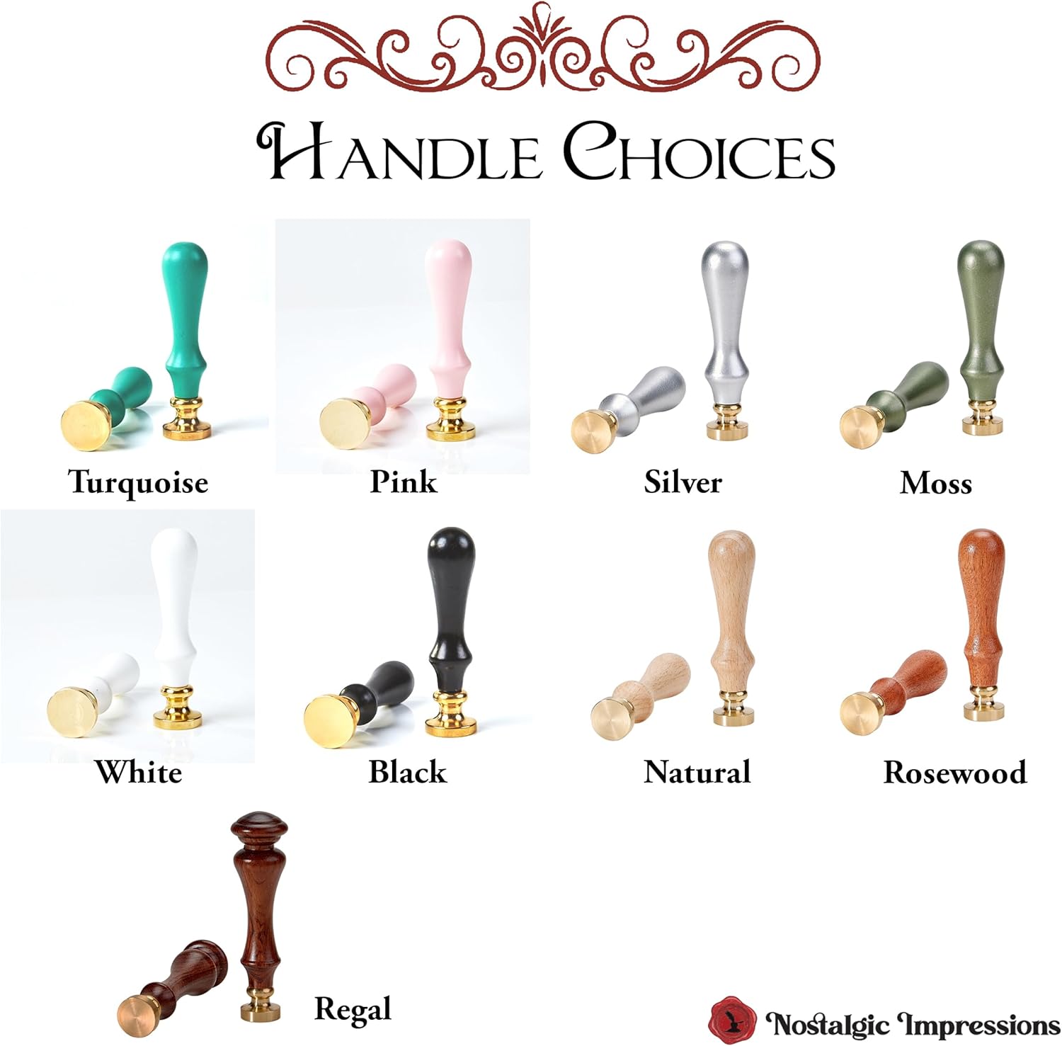 - Removeble Brass head in high quality Brass- the material of choice when it comes to engraving on wax seal stamps. Our Premium brass die improves heat control which reduces stickiness. Brass die face is 1" in diameter and makes approximately a 1.25" wax seal. Optional Wood Handles are 3.5” tall .