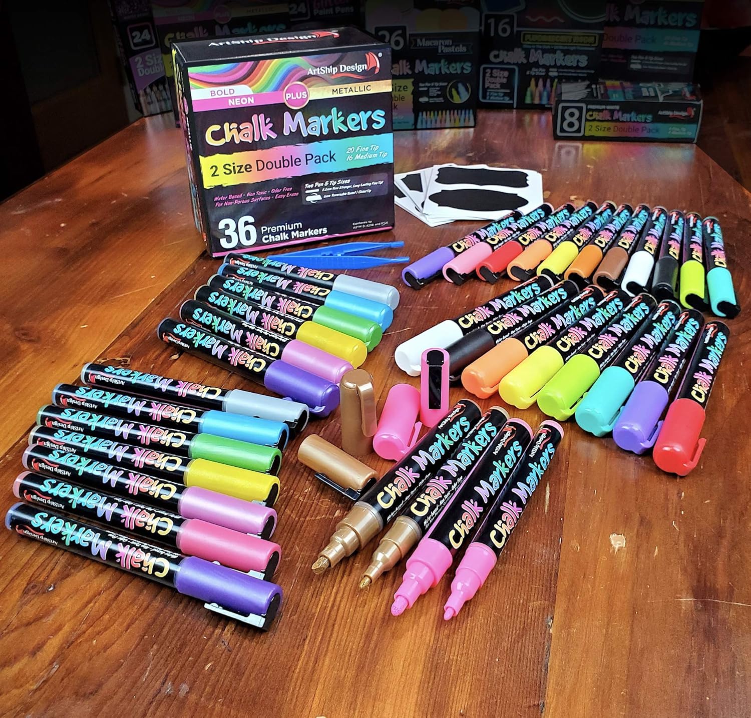 ArtShip Design 36 Chalk Markers Double Pack of Both Fine & Reversible Medium Tip Liquid Chalk Pens with Labels & Tip Tweezers Wet Erase Menu Boards, Windows, Mirrors, Non-Porous Chalkboards, Metal
