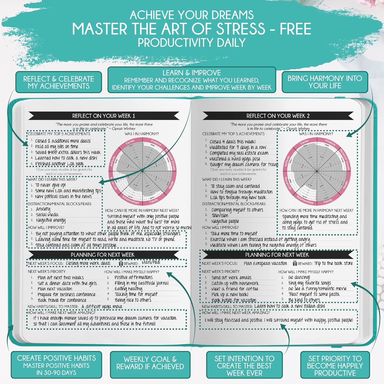 - MANIFESTATION JOURNAL - This deluxe daily planner and gratitude journal for women comes in A5 size (5.8 x 8.3 inches). The life planner comprises 264 pages of thick 100 gsm paper, including 90 daily planning sheets, guiding you on how to become the best possible version of yourself on a mental, physical, and interpersonal level. It's a unique diary based on leading scientific studies proven to increase productivity and happiness. The journal features an out-foldable vision board to help you stay focused, morning and evening power questions, mind maps, reflection pages, habit trackers, a back pocket, and much more than any other planner on the market!