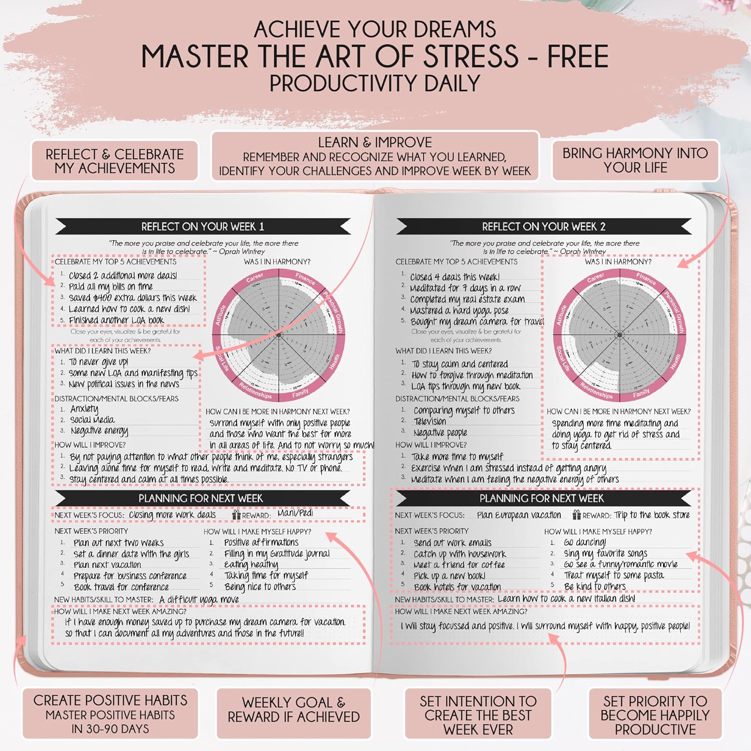 - MANIFESTATION JOURNAL - This deluxe daily planner and gratitude journal for women comes in A5 size (5.8 x 8.3 inches). The life planner comprises 264 pages of thick 100 gsm paper, including 90 daily planning sheets, guiding you on how to become the best possible version of yourself on a mental, physical, and interpersonal level. It's a unique diary based on leading scientific studies proven to increase productivity and happiness. The journal features an out-foldable vision board to help you stay focused, morning and evening power questions, mind maps, reflection pages, habit trackers, a back pocket, and much more than any other planner on the market!
