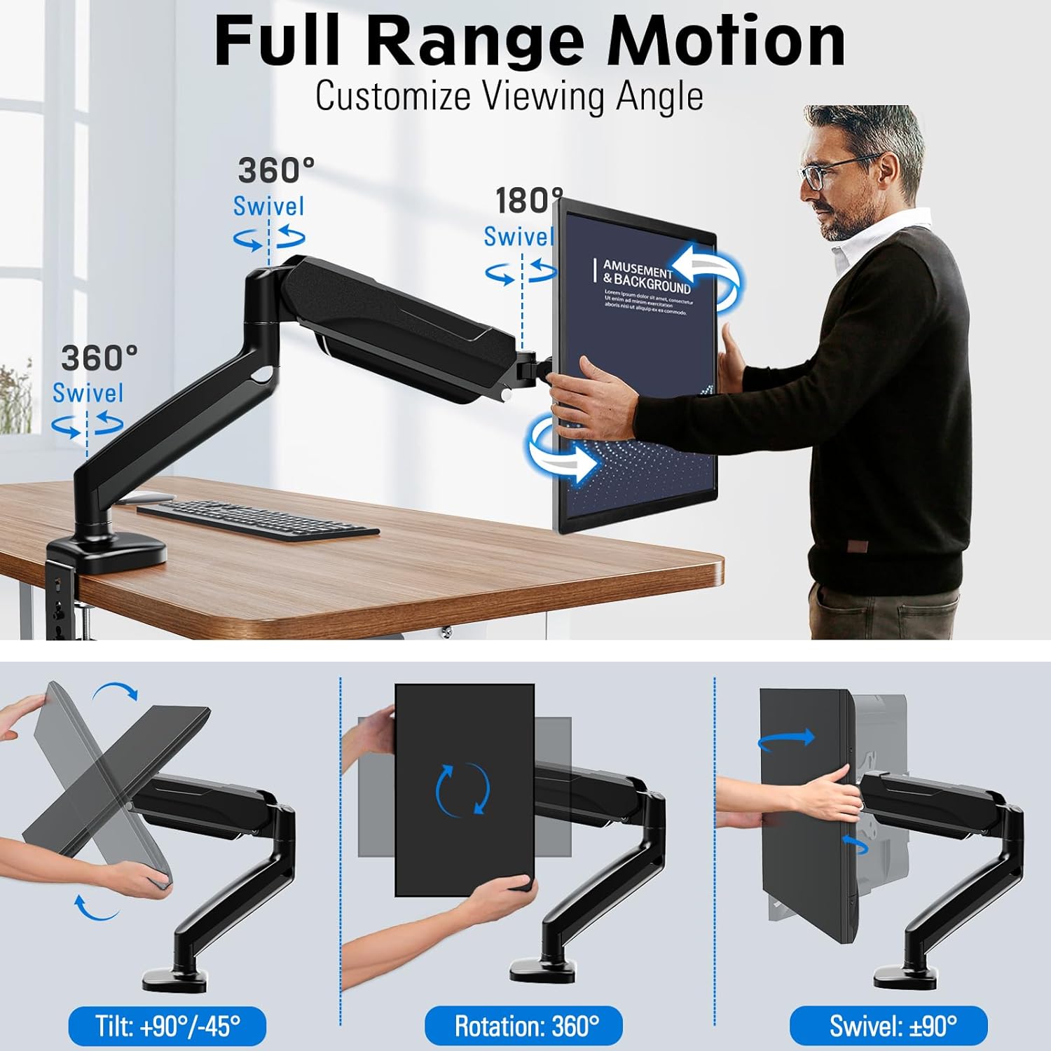 - Full Motion Monitor Stand: This single monitor arm offers a wide range of movement. Support screen rotate 360° for landscape or portrait orientation, swivel 180° to share your display, tilt up 90°/down 45° for better viewing. The arm can extend up to 19.8" long, rise up to 16.9" in height. Easy to find the right viewing angle and position. 𝐏𝐥𝐞𝐚𝐬𝐞 𝐚𝐝𝐣𝐮𝐬𝐭 𝐭𝐞𝐧𝐬𝐢𝐨𝐧 𝐚𝐟𝐭𝐞𝐫 𝐡𝐚𝐧𝐠𝐢𝐧𝐠 𝐨𝐧 𝐦𝐨𝐧𝐢𝐭𝐨𝐫.