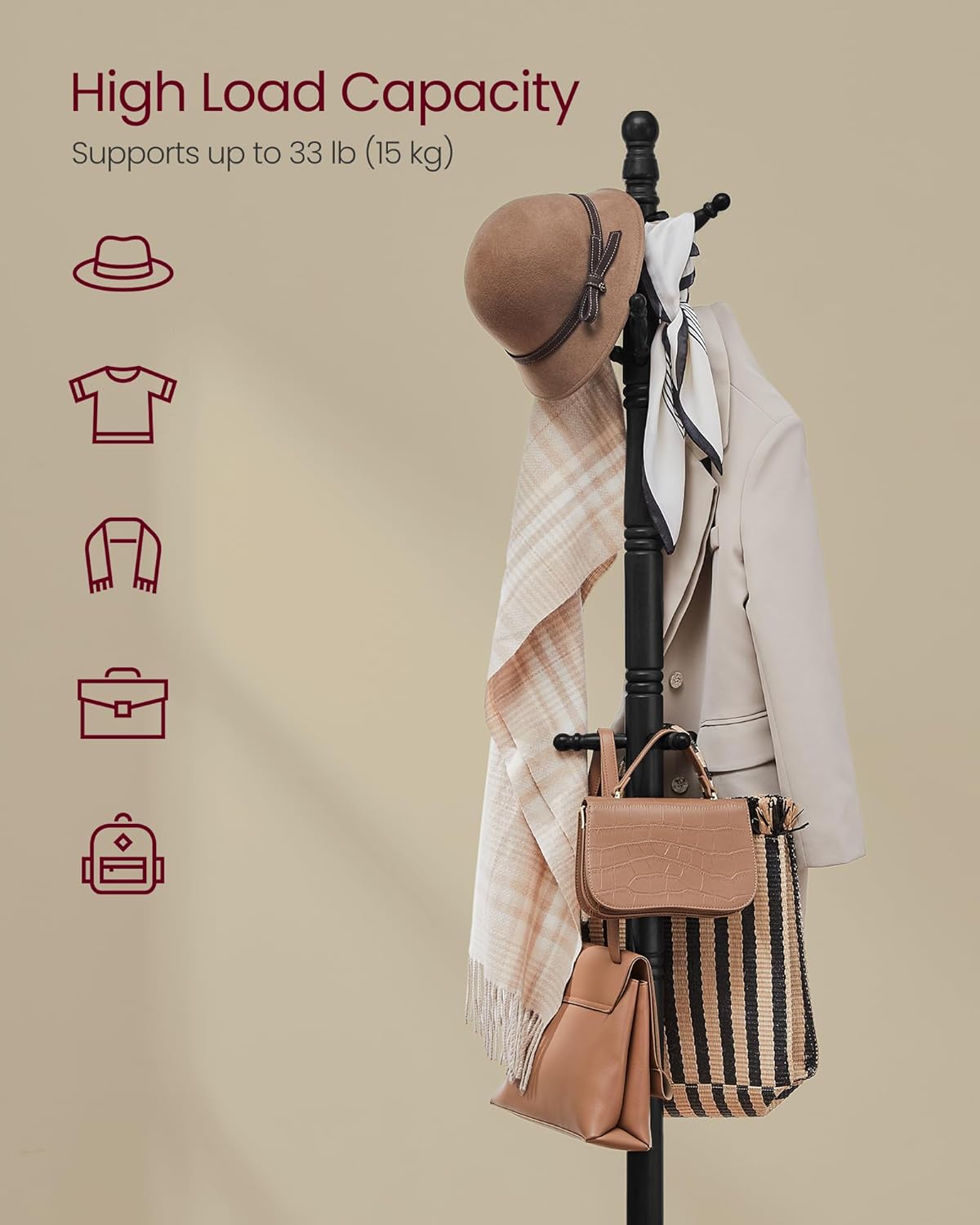 VASAGLE Solid Wood Coat Rack and Stand, Free Standing Hall Coat Tree with 10 Hooks for Hats, Bags, Purses, for Entryway, Hallway, Rubberwood, Ink Black URCR003B01
