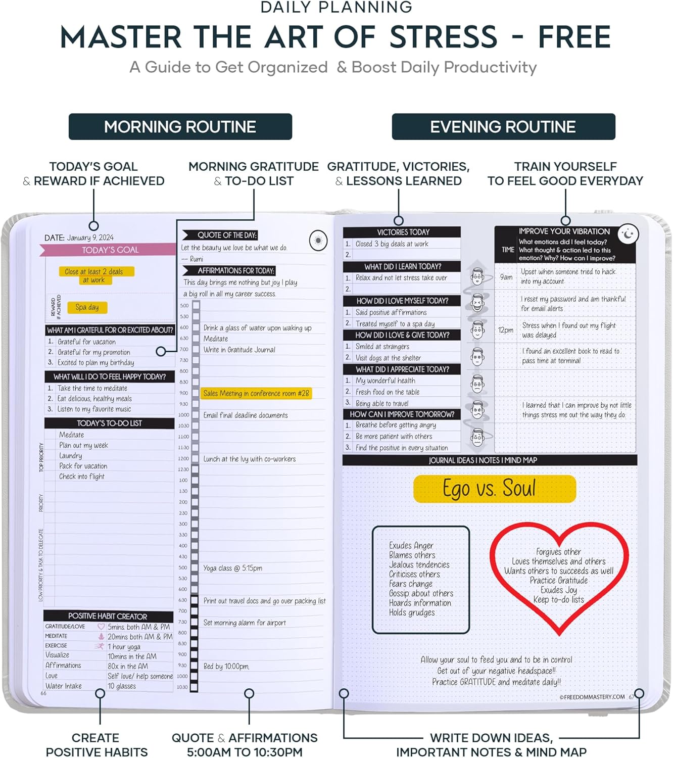 - DAILY JOURNAL FOR BOTH WOMEN AND MEN - Guaranteed to enhance happiness and positive mood. The Five Minute Gratitude Journal, suitable for both genders, is backed by our unwavering confidence. This life planner comprises 264 pages, including 90 daily planning sheets, a 6-month overview, and 15 dotted journal pages. It’s a Self-Care Planner that’s 100% ECO & VEGAN FRIENDLY, utilizing Forest Stewardship Council (FSC) certified paper to protect rare old-growth forests.