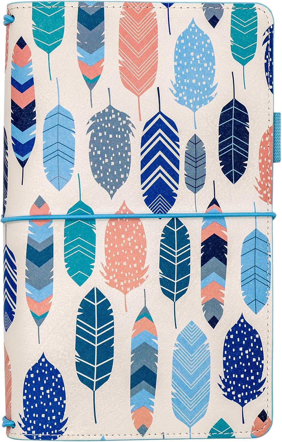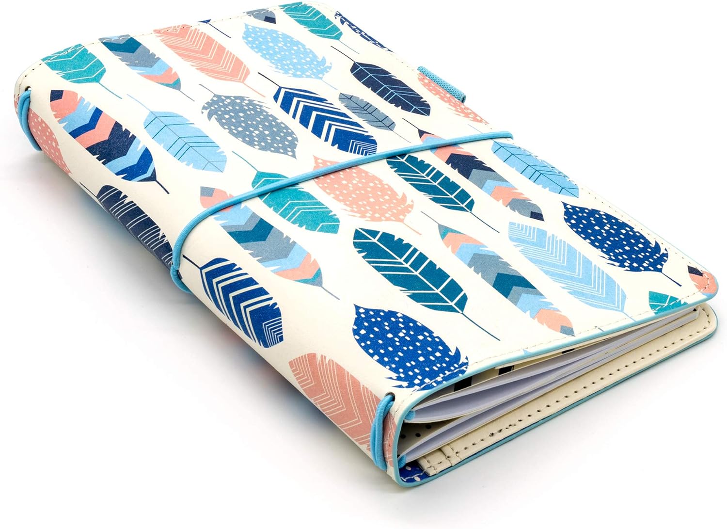 Pukka Pad, Carpe Diem Refillable Traveler’s Notebook Cover – Faux Leather Portfolio with Blank and Lined Notepads – Includes 6 Pockets, Pen Loop, and Elastic Closure – 8.5 x 5.5 Inches, Feathers