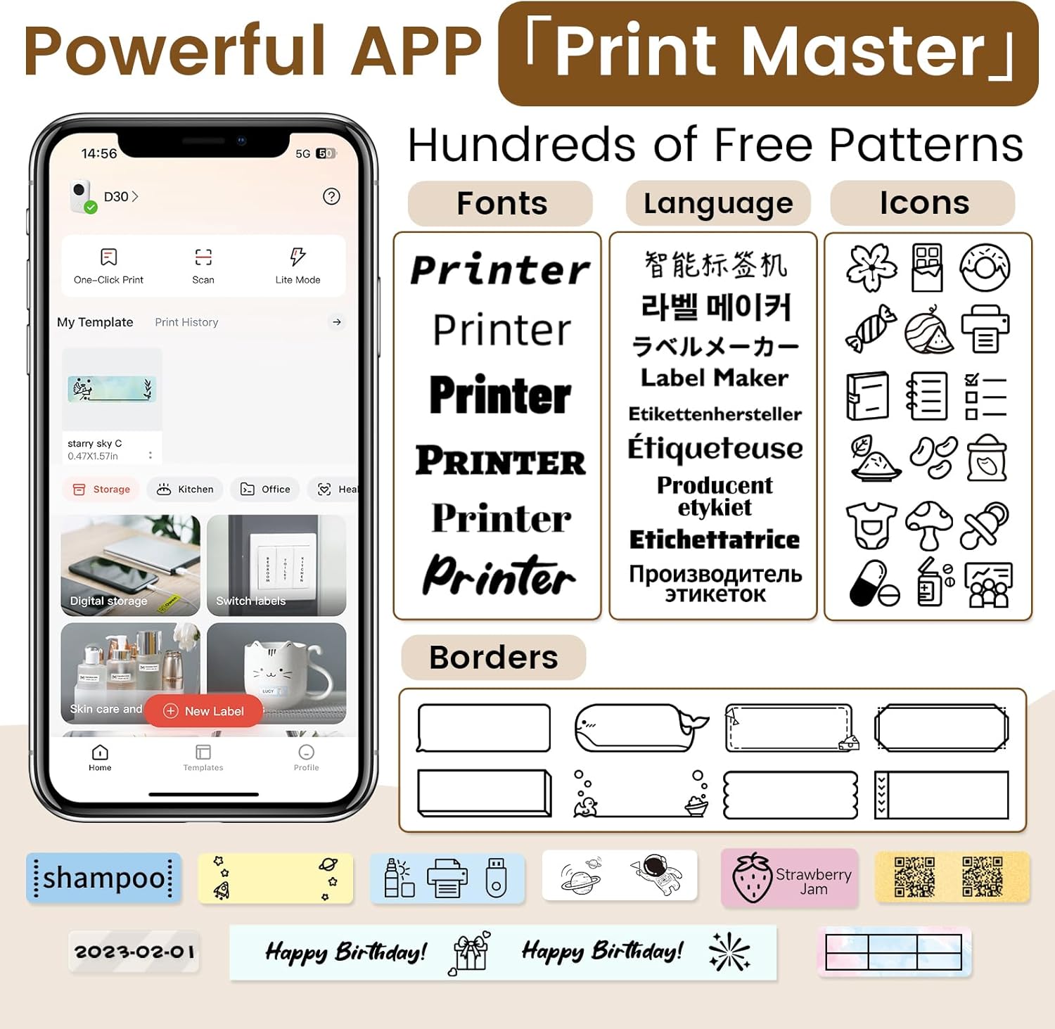 - 2025 Upgrade Version - The Phomemo D30 Bluetooth label maker supports continuous and fixed-length label tapes. It is half the weight and size of traditional label makers and is equipped with a German thermal print head. Print quality has increased by 25%, providing superior clarity, hassle-free operation, smooth printing, and fast processing