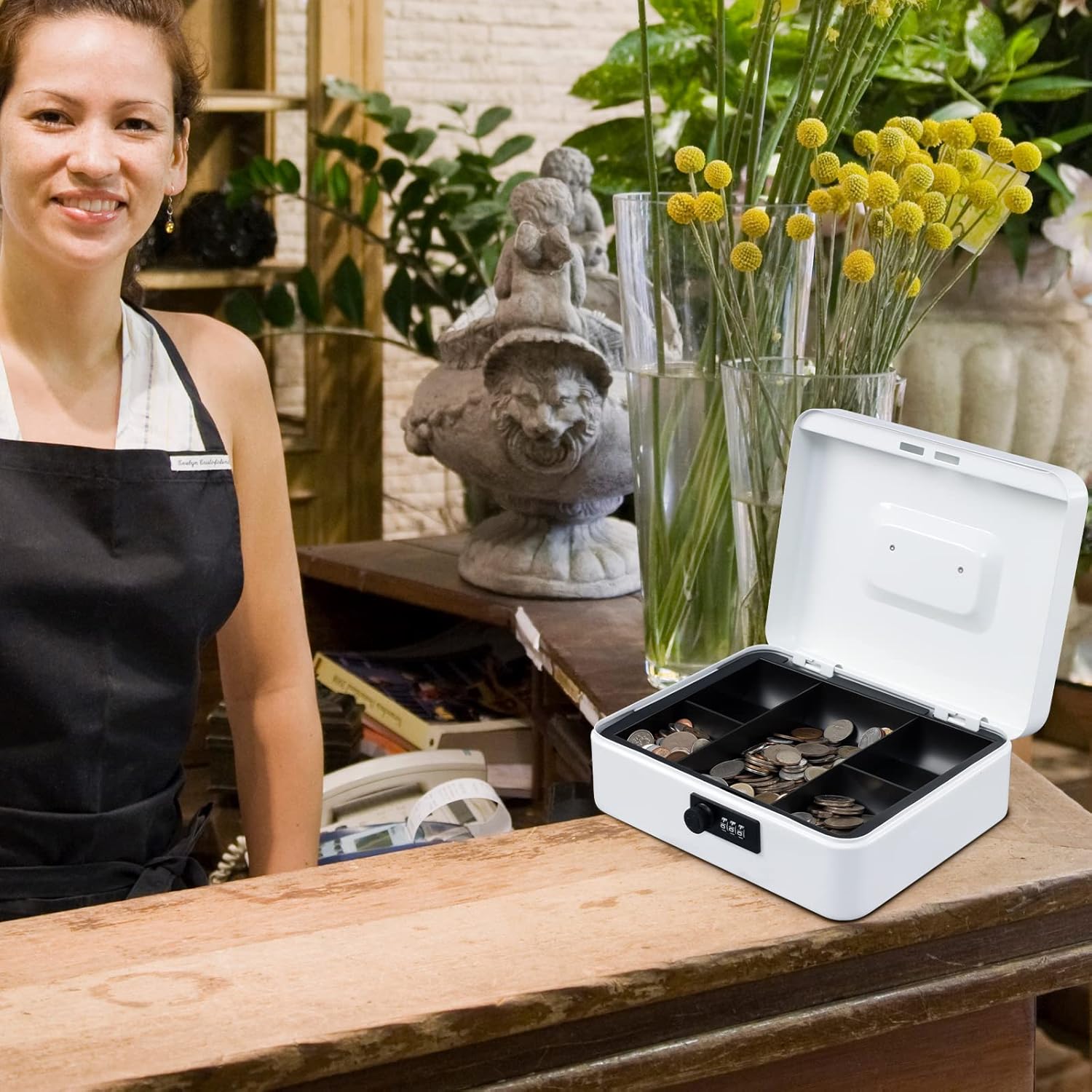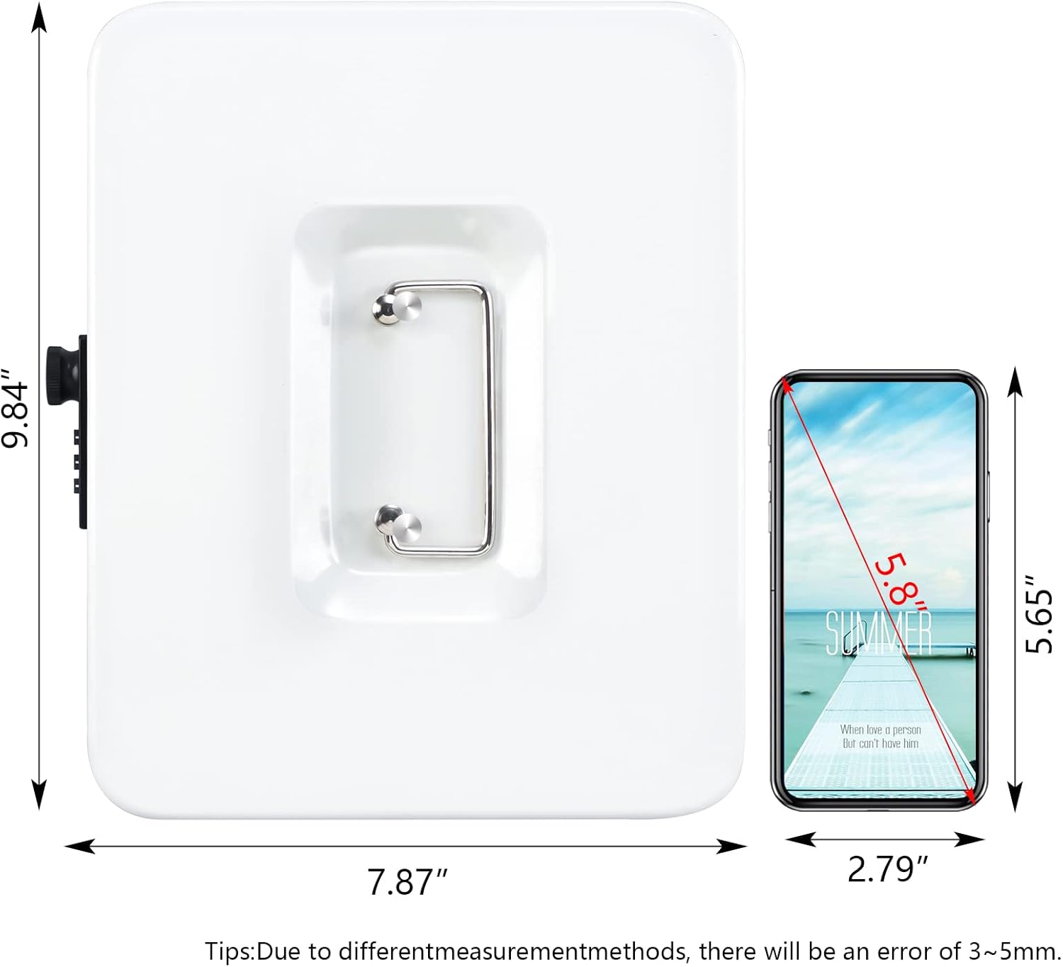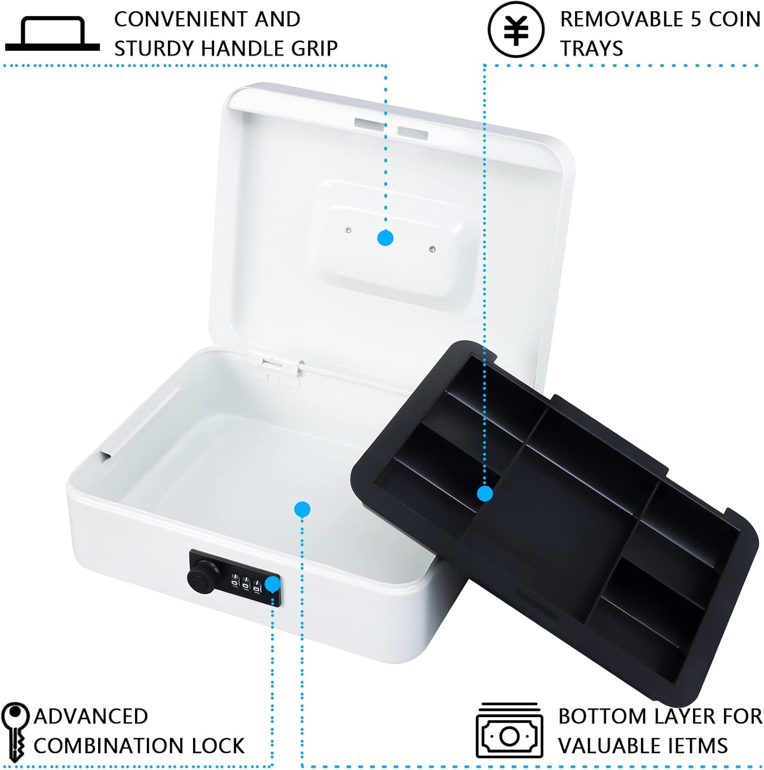 KYODOLED Large Cash Box with Combination Lock,Safe Metal Box for Money, Storage Lock Box with Money Tray,9.84"x 7.87"x 3.54" White Large