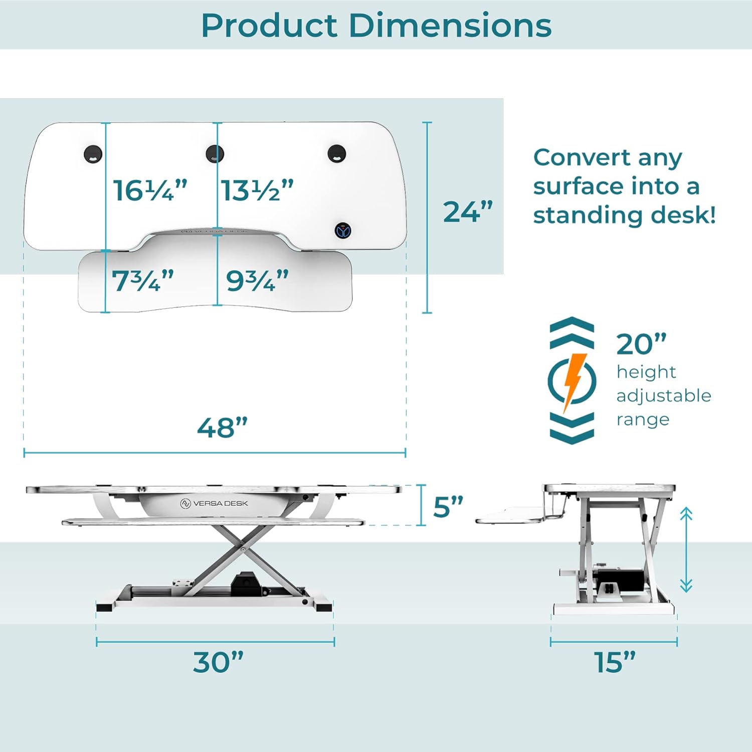 - READY TO USE - The desk riser ships fully assembled; attach the keyboard in less than 5 minutes and it is ready to go! The white washboard finish will allow you to use the surface with a dry erase marker for quick note taking! Place the VersaDesk Converter on top of your table/desk/workspace; Made in the USA;Size: 48" W x 24" D