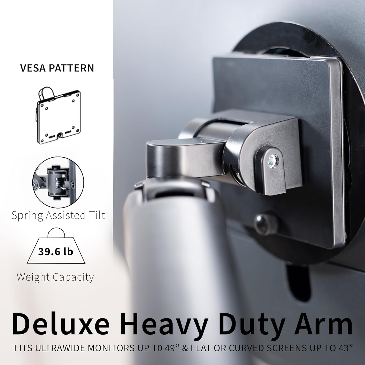 - Fits Ultra Wide Screens - Single monitor mount fitting most ultrawide screens up to 49" and up to 18kg in weight with VESA 75x75mm, 100x100mm, or 200x100mm (adapter provided) hole patterns. Secures to your desk (up to 8.4cm thick) with heavy-duty C-clamp or optional grommet mount.
