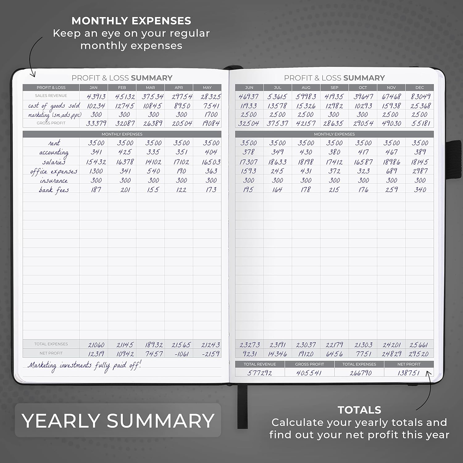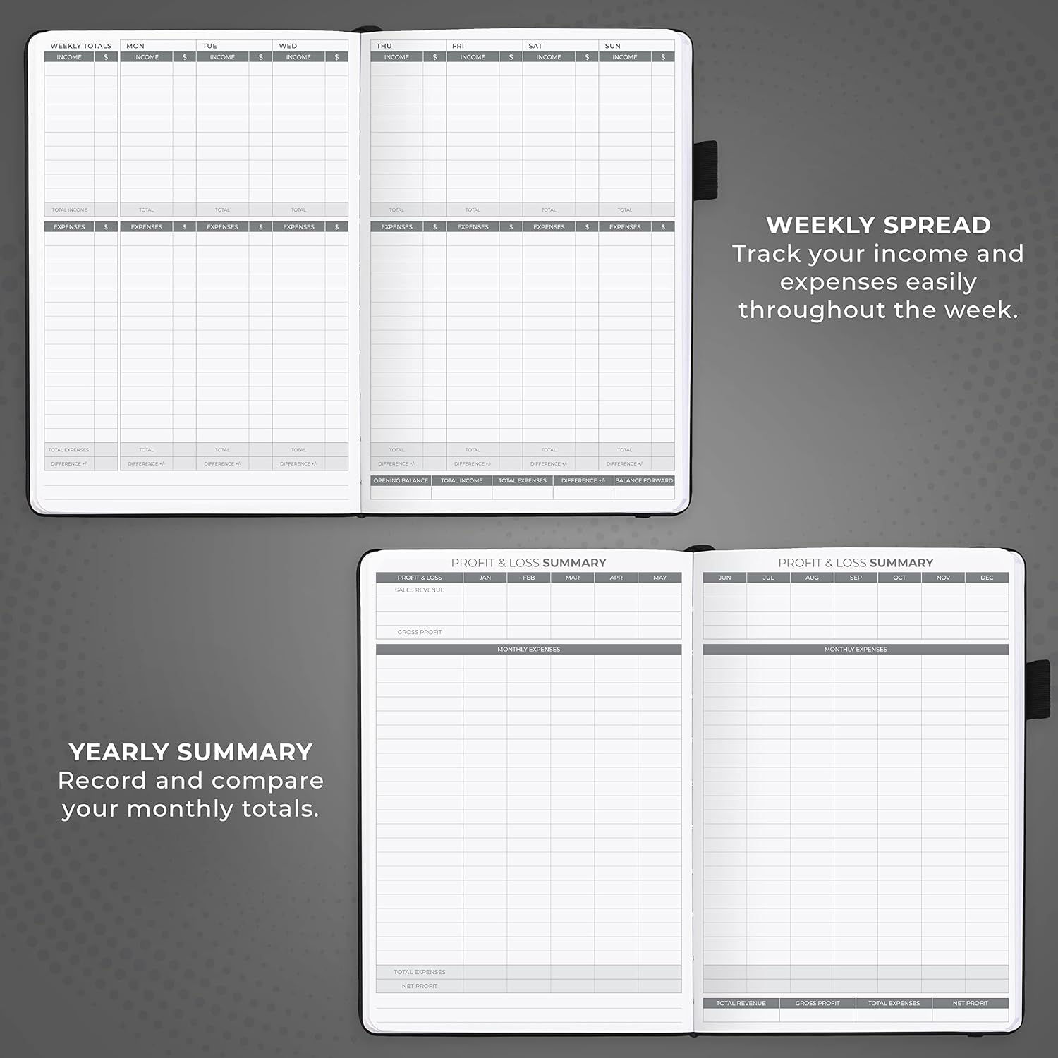 - COMPACT A5 FORMAT & DURABLE DESIGN: This bookkeeping record book comes in A5 format (5.8 by 8.3 inches) and has an eco-leather hardcover, 120gsm no-bleed paper, elastic, pen loop, bookmark, pocket for notes, and a user guide.