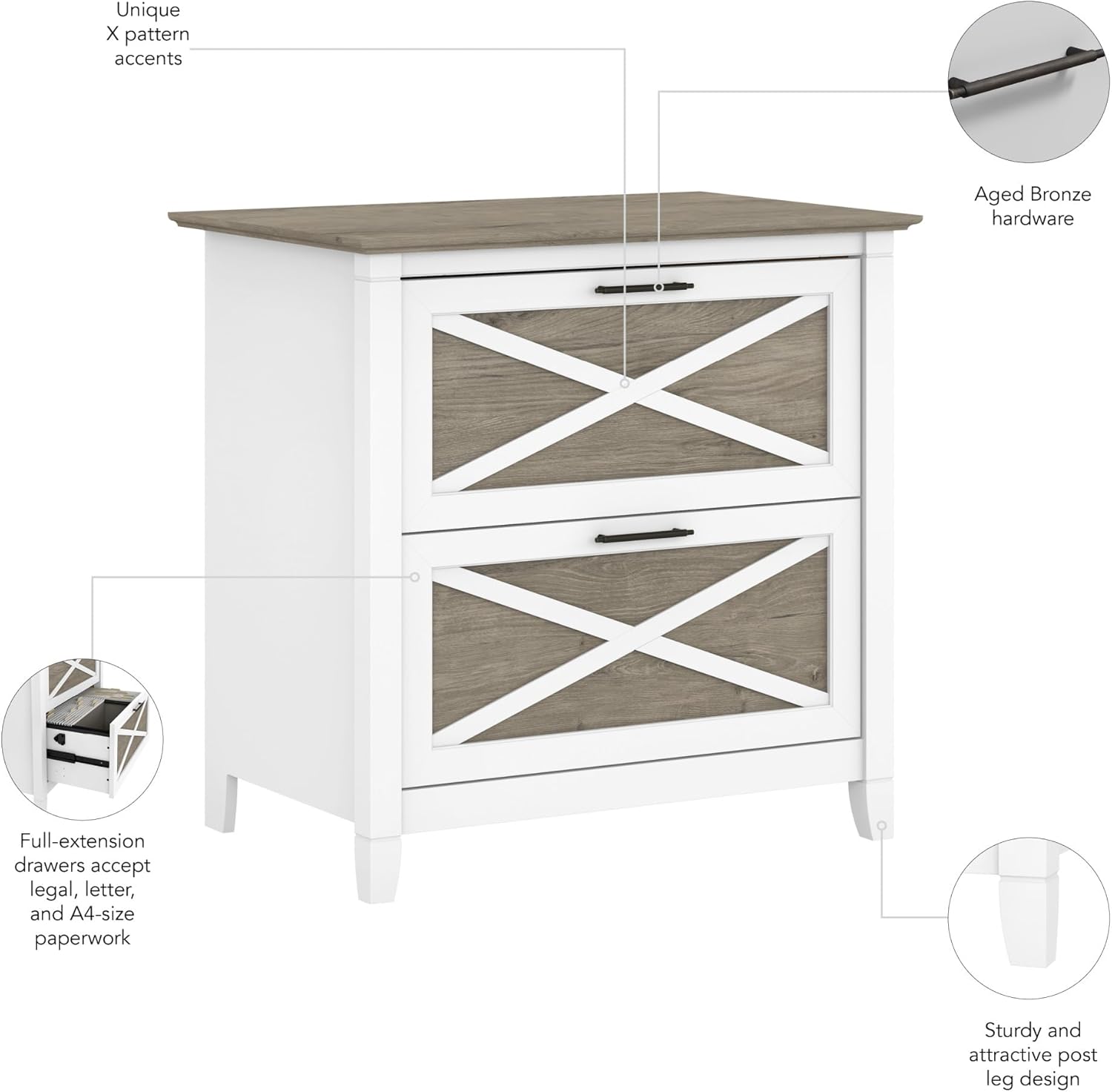 - MODERN FARMHOUSE STYLE: Drawers with unique X pattern accents, a sturdy post leg design, and your choice of several slightly distressed finish options give this farmhouse filing cabinet a look that works well in homes with casual style. The Key West Collection's easy-going charm is a perfect way to convey a relaxed coastal vibe in any living space.