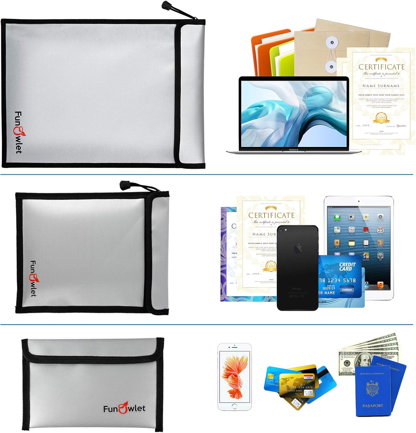 - 3 Different Sizes for Diverse Demand: The FunOwlet set includes a 15 x 11-inch fireproof document bag, a 10 x 7.8-inch fireproof envelope bag, and an 8 x 5-inch small fireproof wallet bag. With ample capacity and versatile use, these bags can securely store all your valuables, including bank deposits, legal documents, cash, coins, credit cards, letters, precious photos, marriage certificates, passports, and more.