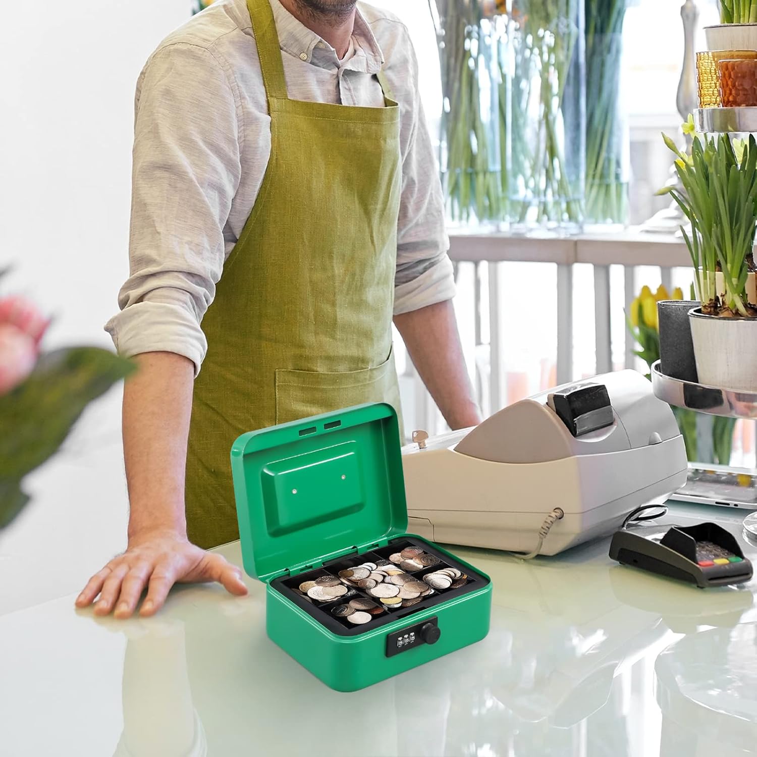 KYODOLED Cash Box with Combination Lock,Safe Metal Box for Money,Storage Lock Box with Money Tray,7.87"x 6.30"x 3.54" Green Medium