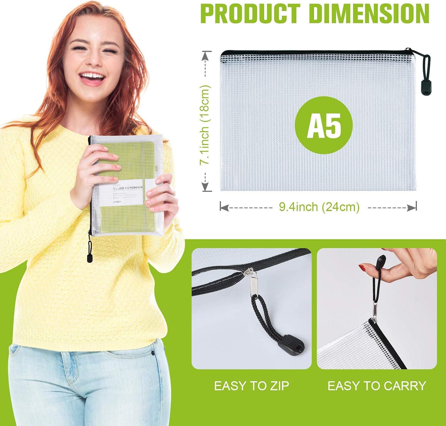 12 Pcs Plastic Mesh Zip File Bags, Waterproof Tear-Resistant Document File Folders, A5 Size Zipper Documents Pouch Document Organizer Bags for School Office Home Travel Storage(9.4×7.1Inch)