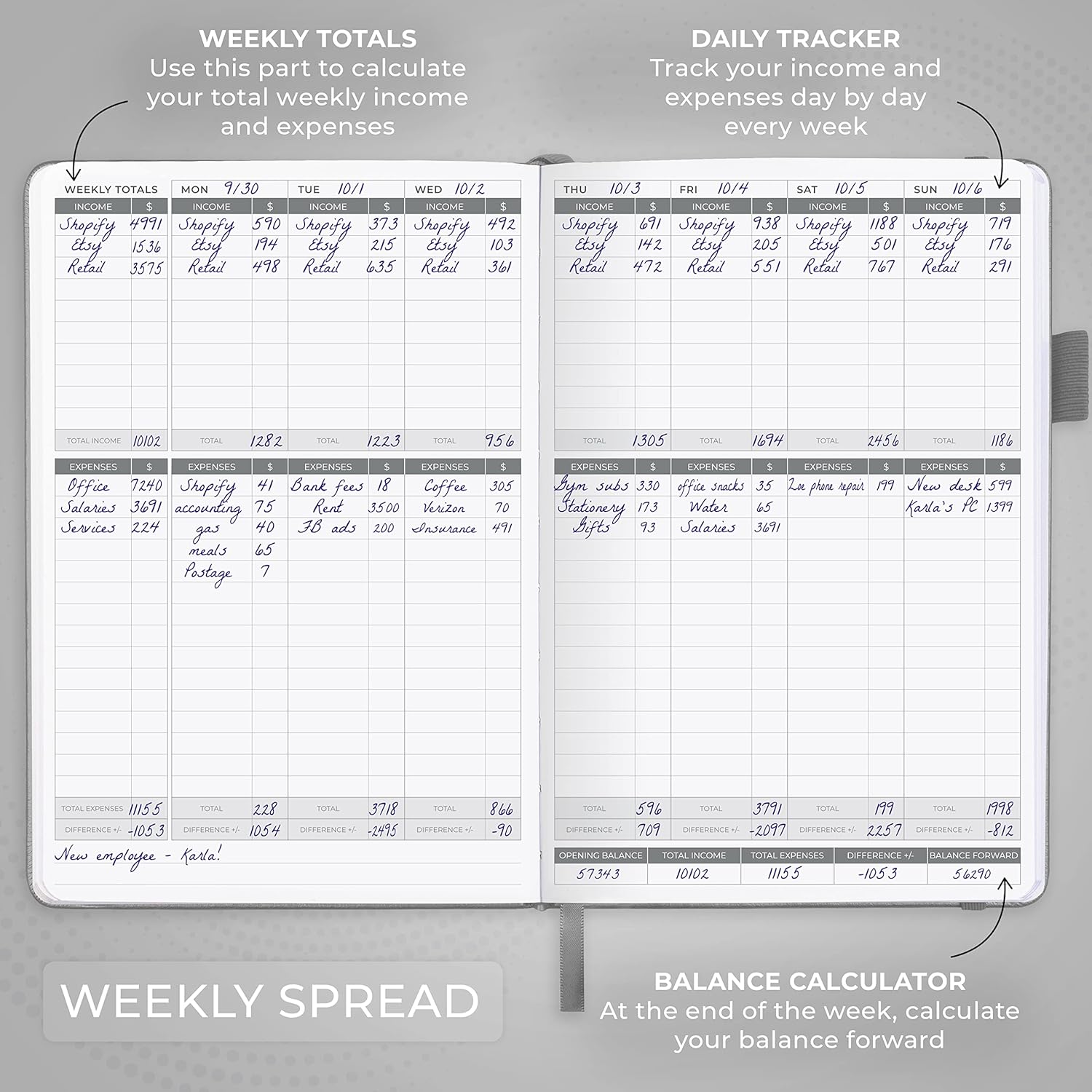 - SWITCH TO EFFICIENT & STRESS-FREE ACCOUNTING: This accounting book is undated and lasts a whole year and has 113 pages, including 53 weekly views, an annual summary, empty note pages, and, at the back, a spacious pocket for receipts.