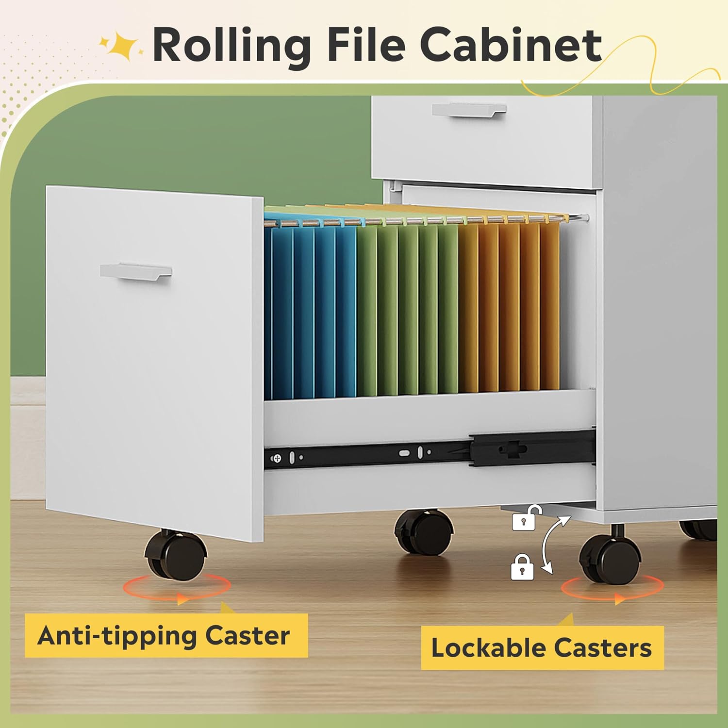 DEVAISE 3 Drawer Wood Mobile File Cabinet, Rolling Filing Cabinet for Letter/A4 Size, White