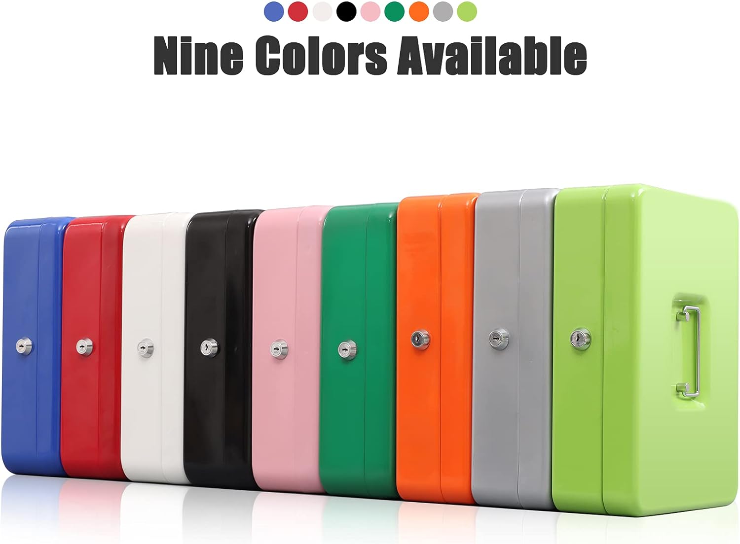 - SIZE AND COLORS: The size of the cash box is 11.81 * 9.45 * 3.54 inch, providing enough space to store cash, coins, precious jewelry, watches, etc. The cash box has a lot of colors, such as classical black, silvery gray, orange, blue, pink and fruit green, which can meet most customers’ demands.
