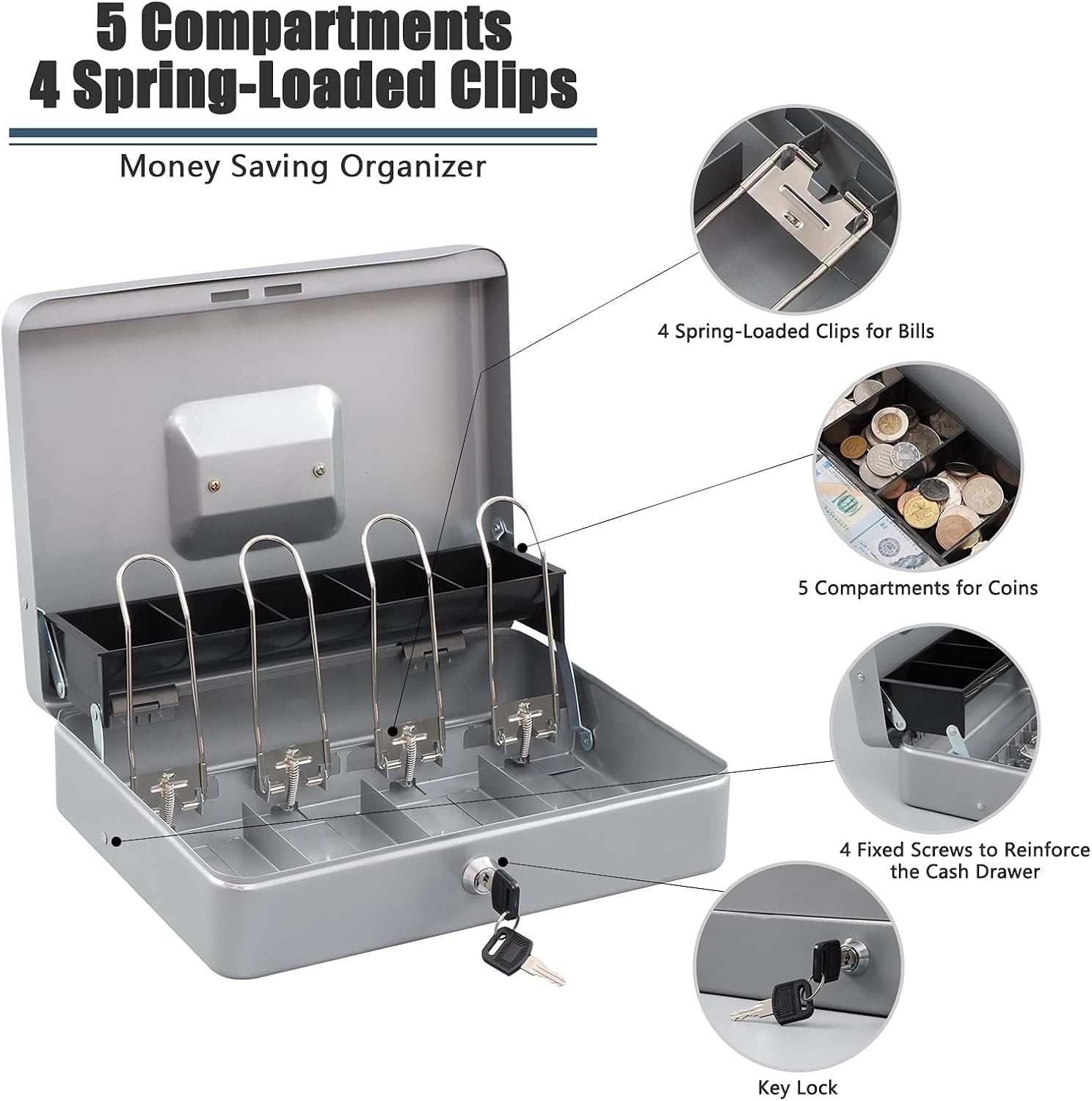 - KEY LOCK: The cash box has a sturdy key lock to keep valuables safe. The key is easy to operate, which can be opened without problem with one hand. The widened handle makes it easy for storage and transportation.