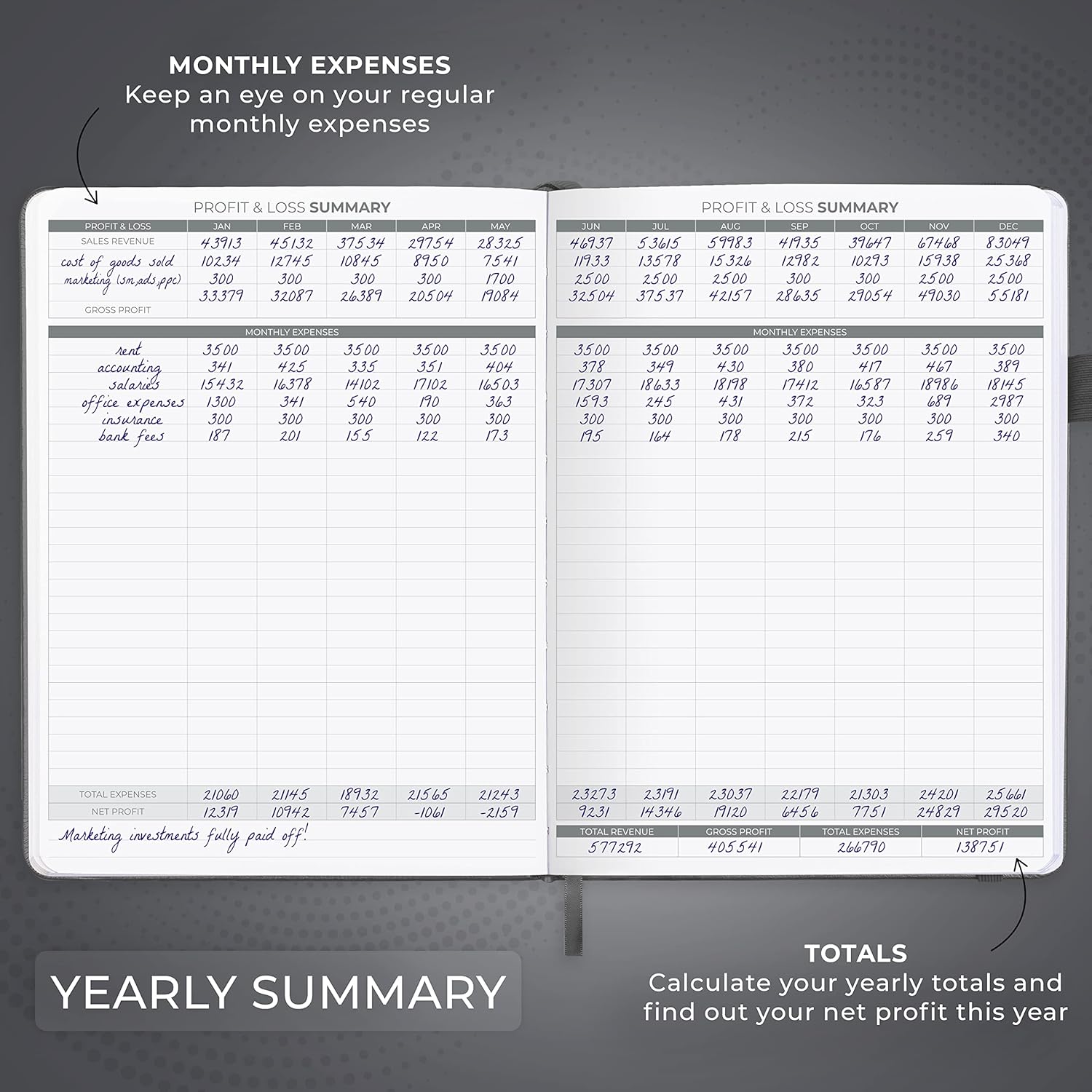 - LARGE A4 FORMAT & DURABLE DESIGN: This bookkeeping record book comes in A4 format (8.5 by 11.2 inches) and has an eco-leather hardcover, 120gsm no-bleed paper, elastic, pen loop, bookmark, pocket for notes, and a user guide.