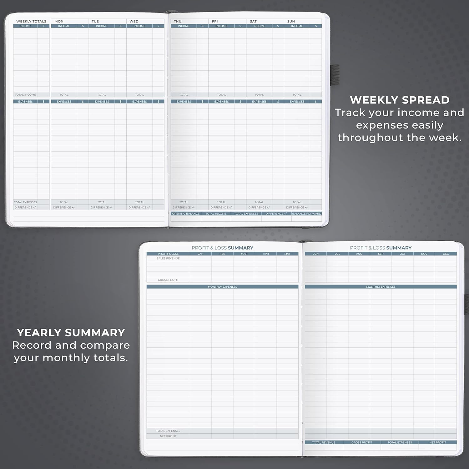 - 2 FULL YEARS OF STRESS-FREE ACCOUNTING: This accounting book is undated and lasts 2 years and has 225 pages, including 106 weekly views, 2 annual summaries, empty note pages, and, at the back, a spacious pocket for receipts.