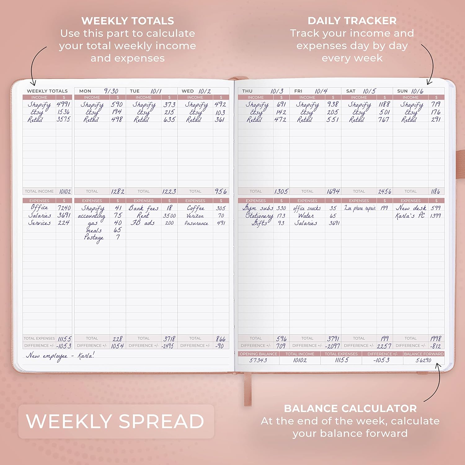 - 2 FULL YEARS OF STRESS-FREE ACCOUNTING: This accounting book is undated and lasts 2 years and has 225 pages, including 106 weekly views, 2 annual summaries, empty note pages, and, at the back, a spacious pocket for receipts.